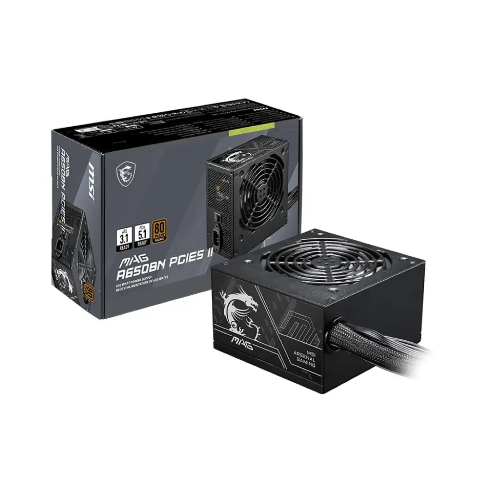 MSI MAG A650BN — блок живлення потужністю 650 Вт у стандартному форм-факторі ATX, створений для використання в сучасних настільних комп’ютерах. Завдяки сертифікації 80 PLUS Bronze він забезпечує високий ККД і знижене тепловиділення, а активна корекція коефіцієнта потужності (Active PFC) гарантує стабільну роботу навіть за коливань вхідної напруги. Комплект компонентів розрахований на експлуатацію при високих температурах, а конденсатори з робочим порогом до 105°C додають надійності системі.