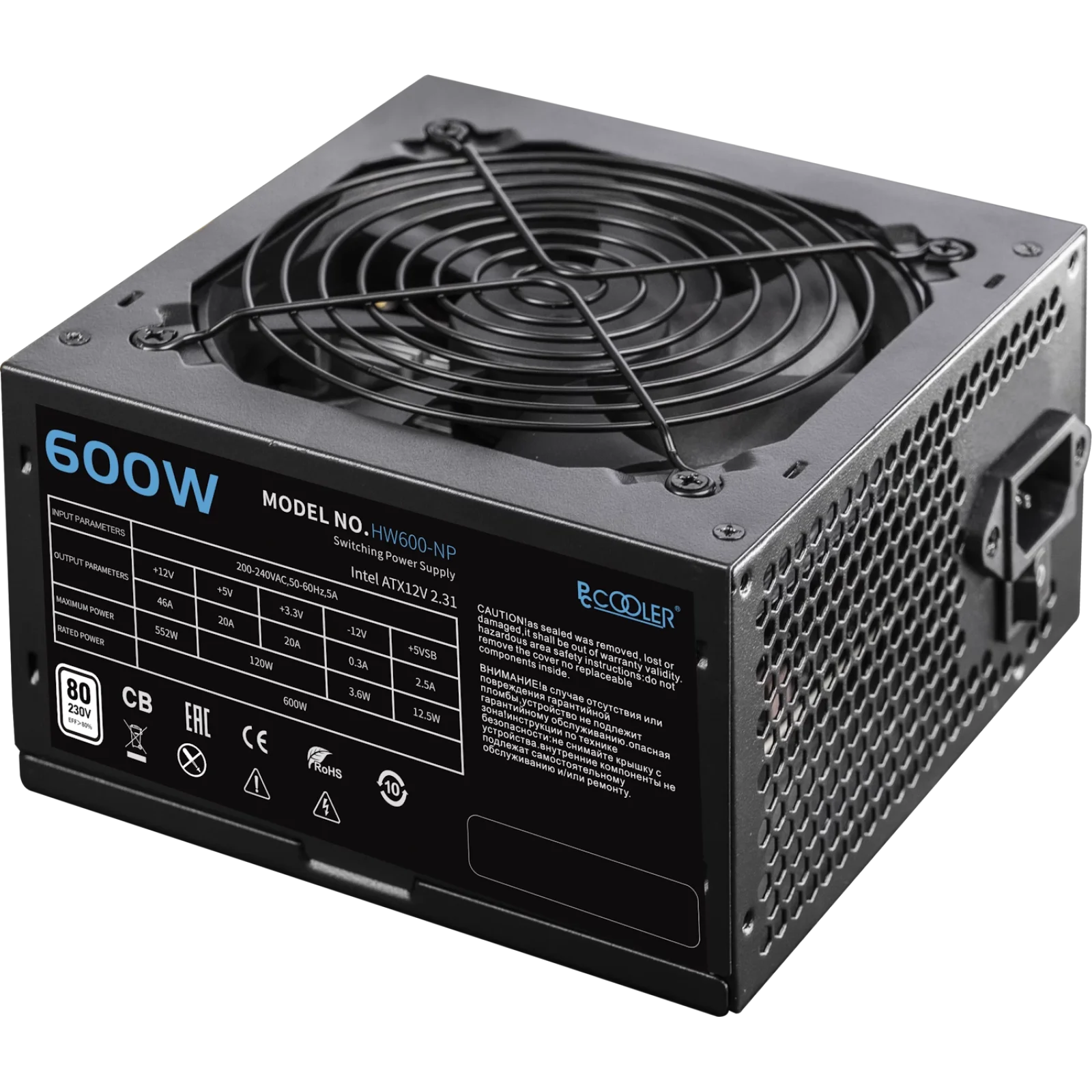 HW600-NP має коефіцієнт корисної дії 80% та підтримує стандарт ATX12V 2.31, що забезпечує мінімальні втрати енергії та ефективне використання електрики. Немодульна конструкція та надійні внутрішні елементи роблять блок живлення довговічним і стабільним у роботі.