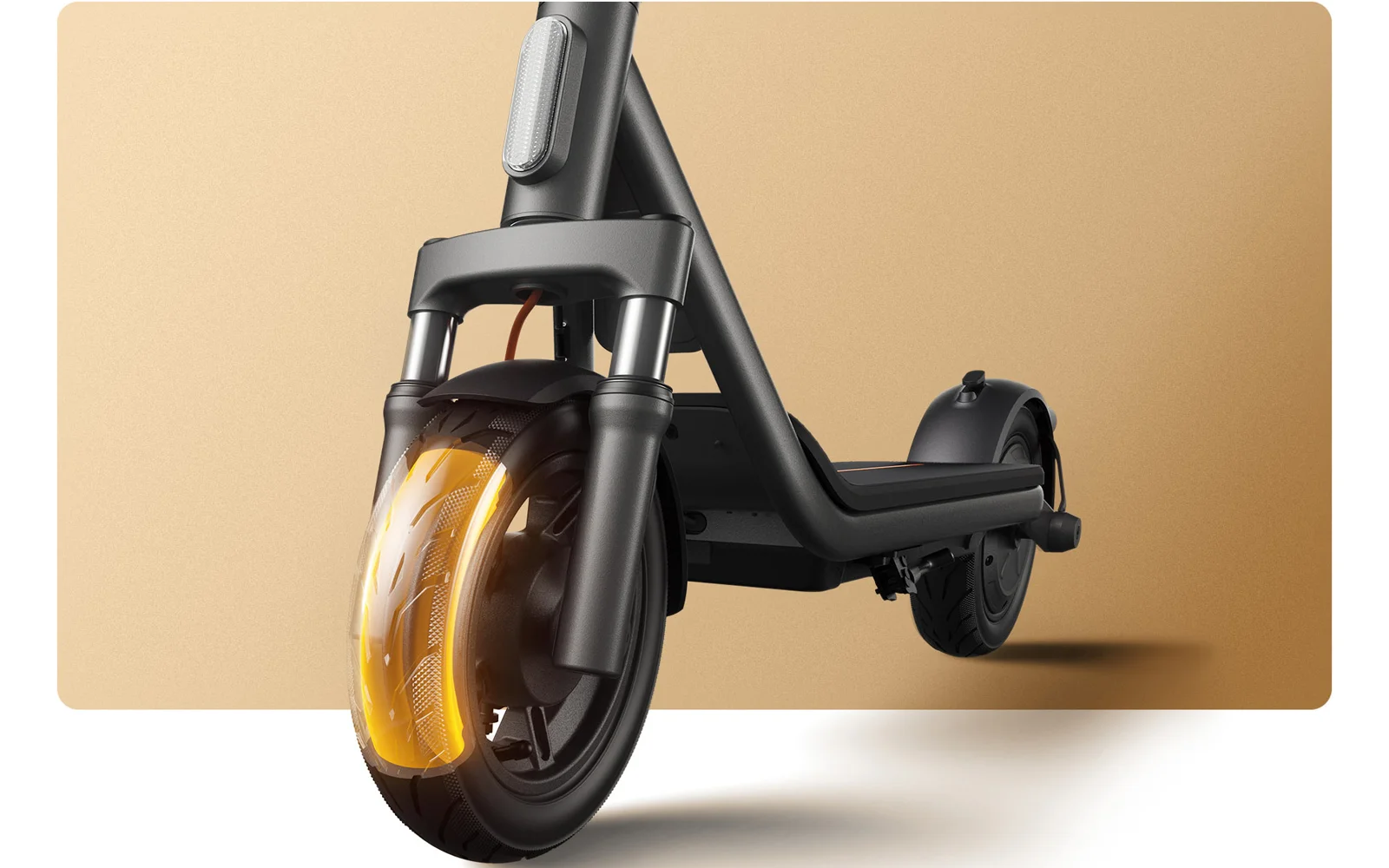 У моделі використовується подвійна гальмівна система – переднє барабанне гальмо та задня система E-ABS. Таке поєднання підвищує стабільність під час уповільнення та додає впевненості у звичайних міських сценаріях і в ситуаціях, де потрібно швидше зреагувати. Для поїздок у темний час доби передбачена яскрава передня фара 2,5 Вт із дальністю освітлення до 15 м, а задній ліхтар під час гальмування блимає, роблячи самокат помітнішим для інших учасників руху.