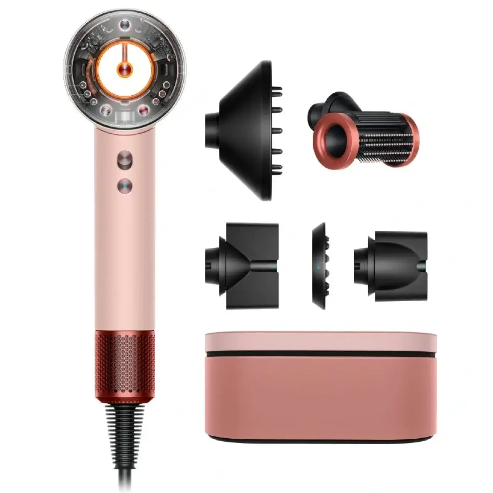 Фен оснащений двигуном Dyson Hyperdymium, який формує потужний високошвидкісний потік керованого повітря. У поєднанні з інтелектуальним контролем температури це дає швидке сушіння без надмірного теплового впливу на волосся. Dyson окремо підкреслює, що система регулює температуру повітря для захисту природного блиску.