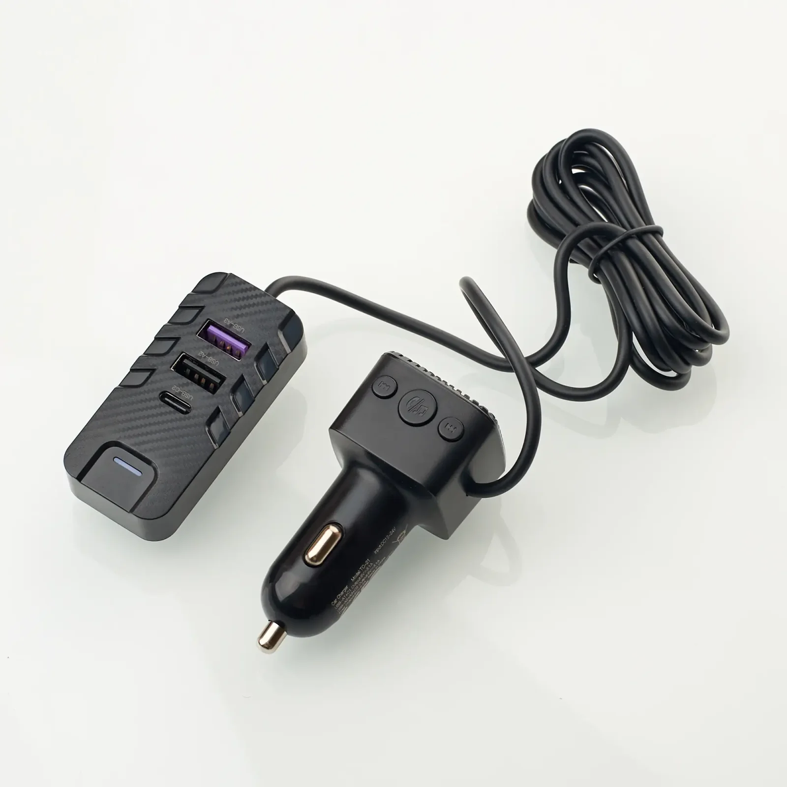 FM модулятор DC (TC-21) . Зарядний пристрій для прикурювача TC-21 має можливість підключення 5 пристроїв одночасно: виходи типу C і USB-A в пеедній частині 5В/3.1А, що вставляється у прикурювач та вихід типу С і два виходи USB-A 5В/3.1А в задній частині, яку можна розмістити в іншій частині салону бо є кабель 150см і затискач для фіксації. Він забезпечує PD з можливістю швидкої зарядки. Має мікросхему безпеки та захищає батарею від пошкоджень, таких як перезарядка, перенапруга, перегрівання, перевантаження по струму та коротке замикання. Пристрій має кольорову світлодіодну смужку із семи різних кольорів, щоб його було легше знайти в темряві. Сумісний з усіма легкими та важкими транспортними засобами. Bluetooth 5.3 має стабільне та швидке з'єднання - це спосіб легкого підключенння для відтворення музики за допомогою цього приймача. Інтелектуальний бездротовий чіп 5.3, сумісний із системами Android та IOS, обробкою зменшення фонового освітлення, відтворення музики та робить дзвінки по мобільному телефону чіткішим. Частотний діапазон зарядки прикурювача становить 87.5-108 МГц. Фізичні параметри: . Матеріал: ABS . Розміри: передня частина 3,47*3,47*7,5см / задня частина 6,5*3*2см . Вага: 100г .