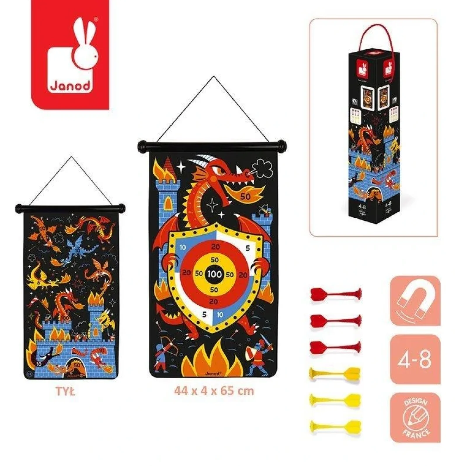 Проводити цікаві змагання, вдосконалювати навички та розвивати окомір дає змогу магнітний дартс «Дракони». Двобічну магнітну мішень можна вішати на стіну, дверну ручку чи дерево. Шість магнітних дротиків без шипів роблять гру безпечною навіть для найменших користувачів. Точки, в які треба влучати, розташовані по колу на одному боці мішені та по всій площі з другого боку. Гра допомагає тренувати дрібну моторику, сприяє розвитку спритності та концентрації уваги. Для дітей від 4-х років.