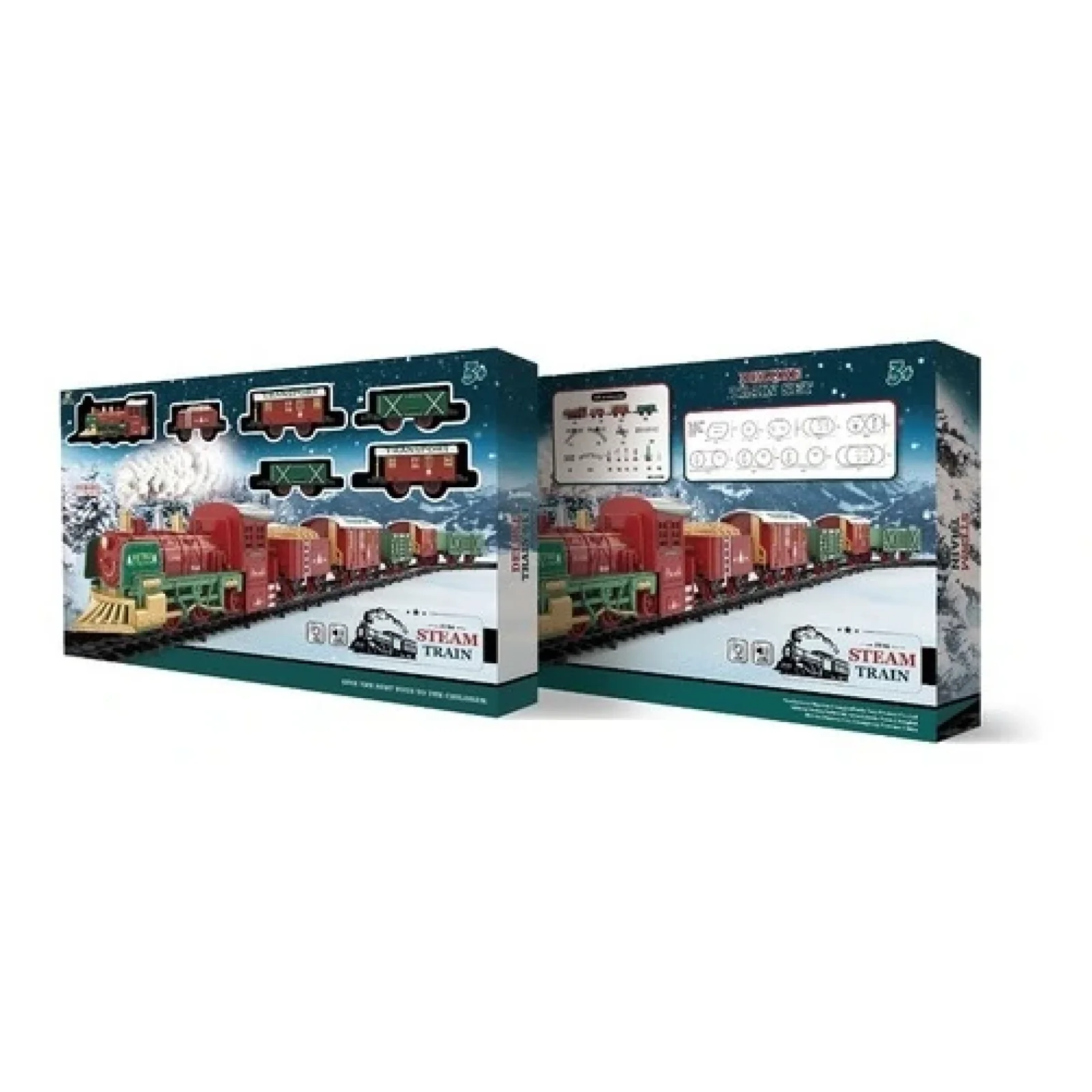 Набір дитячої залізниці містить 1 локомотив, 5 вагонів, 10 кривих рейок, 4 прямих, 8 коротких прямих, 1 поперечну, 4 Y-подібних рейок і аксесуари (2 дерева, 4 вказівники, 1 наповнювач для води). Рейки можна викласти різною конфігурацією. Паровоз має світло, дим і звук. Рекомендований вік: від 3 років. Матеріал: пластик. Живлення: 4 х АА (до комплекту не входять). Упаковка: коробка 71.5*45*6.8см.