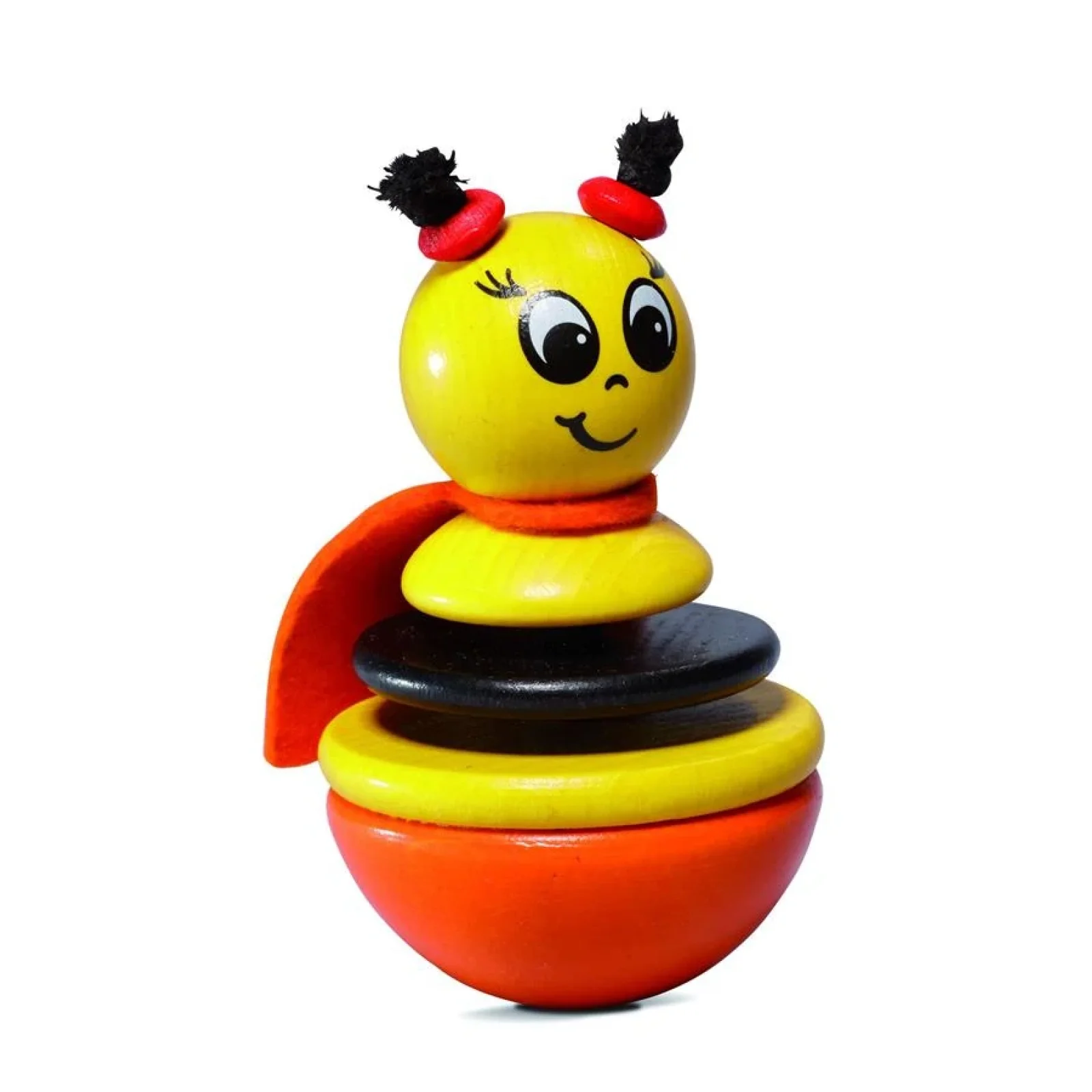 Интересная и веселая неваляшка-погремушка в виде пчелки немецкого производителя игрушек nic для детей от 1 года. Поставляется в фирменной картонной упаковке, завернутая в бумагу. Игрушка сделана из натурального дерева, покрытого цветными красками на водной основе. Использованы такие цвета: желтый, черный, оранжевый и красный – отлично подчеркивают рисунок дерева. Крыльца пчелки изготовлены из оранжевого фетра. Центральные элементы неваляшки имеют вид дисков, нанизанных на гибкий шнурок. Благодаря этому ее части стучат между собой. Высота неваляшки – 10,5 см.