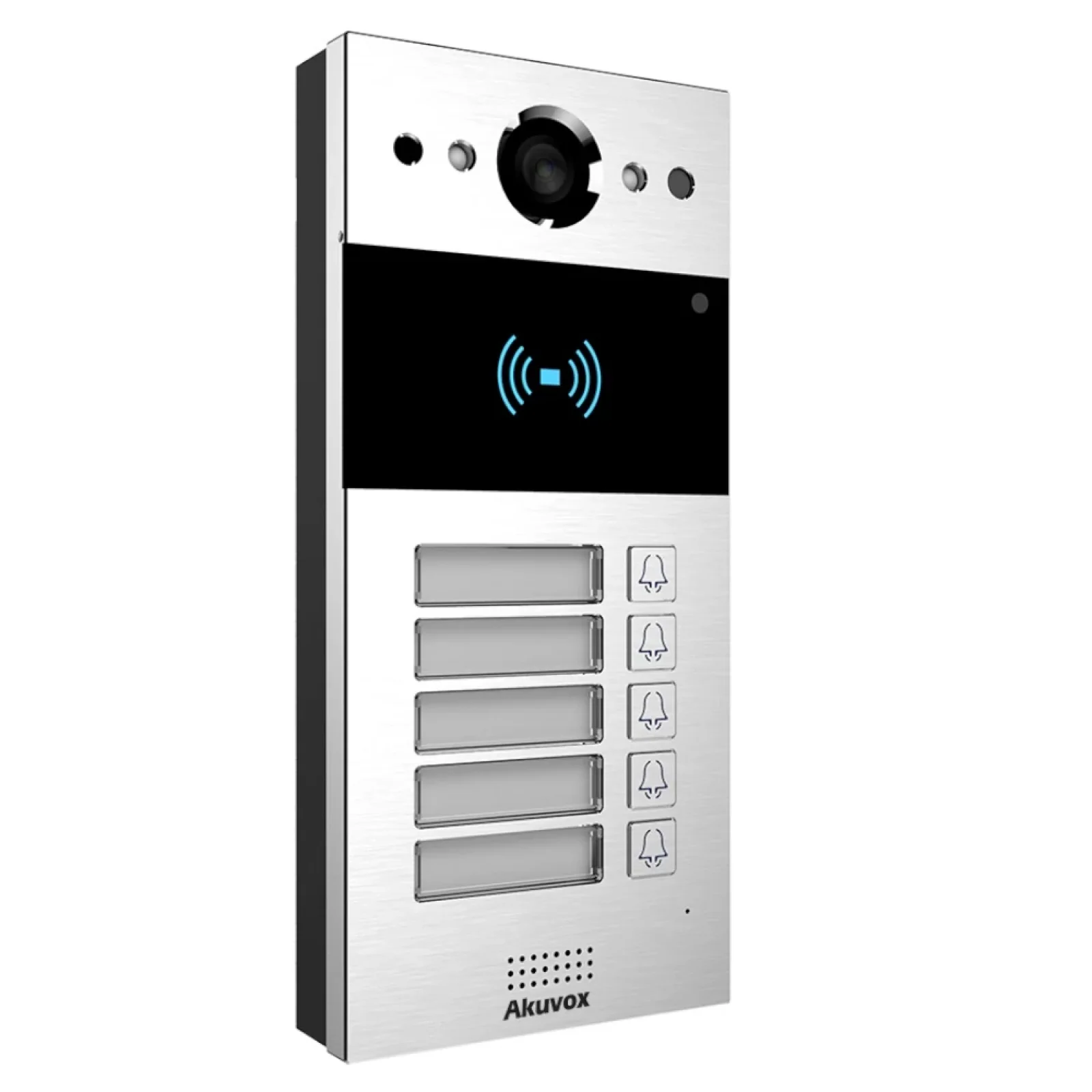 Пяти абонентная SIP панель вызова с камерой и RF-считывателем, 5 кнопок вызова с панелями названий, Совместимость со стандартом SIP для легкой интеграции с любой SIP АТС, Двусторонняя аудио связь с функцией устранения эхо, Камера 2МП, углы обзора: 110° (гориз.)/58° (верт.), Считыватель RF-карт 13.56MHZ и 125KHZ, 2 релейных выхода для открывания дверей, Поддержка PoE (IEEE802.3af), Материал корпуса: алюминий, Класс защиты IP65, настенный монтаж