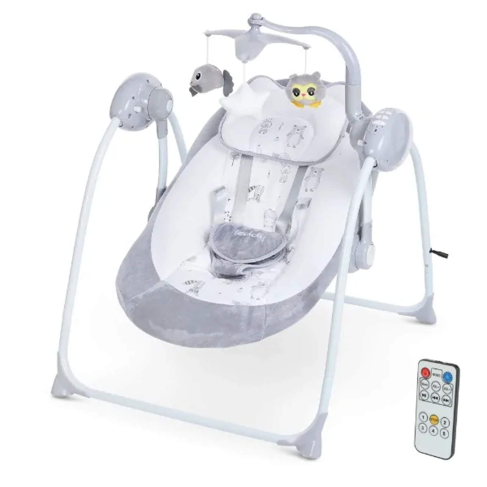 Качели для новорожденного TEDDY получили свое название благодаря подушечке с милыми ушками. В комплект входит мобиль с игрушками, который прекрасно развлечет вашего кроху. Спинку качели можно отрегулировать в 2-х положениях. 12 приятных мелодий, с возможностью регулирования громкости, 2 положения спинки, 5 скоростей укачивания - все это позволит оптимально подстроиться под настроение ребенка. Характеристики: Тип: качели Материал: металл, пластмасса, ткань Возраст ребенка: от рождения до 15 мес. Вес ребенка: до 20 кг Регулировка спинки: 2 положения Безопасность: 5-ти точечные ремни Количество скоростей укачивания: 5 скоростей Эффекты: музыка (12 мелодий, регулятор громкости) Таймер на 5, 15 и 30 минут Питание от сети и от 4-х батареек типа АА 1.5V (не входят в комплект) Комплектация: пульт ДУ адаптер питания съемная подушка 5-ти точечные ремни безопасности 3 подвески Размеры: Размер качели (ДxШxВ): 80x65x77 см Размер спального места: 81x48 см Вес: 4.9 кг Упаковка: коробка Размер упаковки: 15.5x40x63 см Вес в упаковке: 5.6 кг