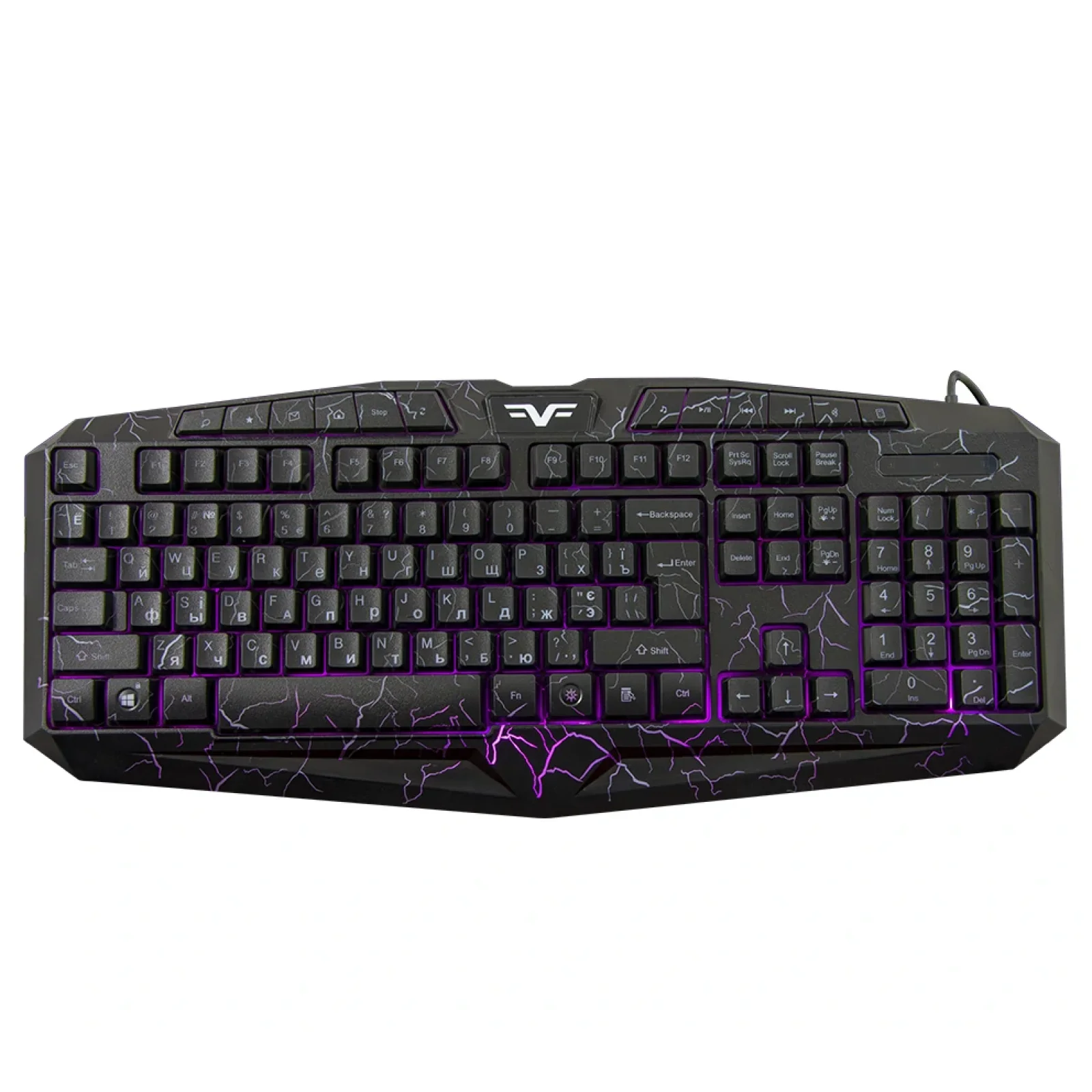 Клавиатура сочетает в себе практичность и привлекательный дизайн, в конструкции предусмотрено 104 кнопки на мембранных переключателях, которые обеспечивают эффективный, удобный ввод данных, длинный кабель 180 см и Rainbow подсветка, что облегчит работу ночью. Модель поддерживает три языковые раскладки — английскую, русскую и украинскую. Подключение к компьютеру осуществляется через USB разъем.