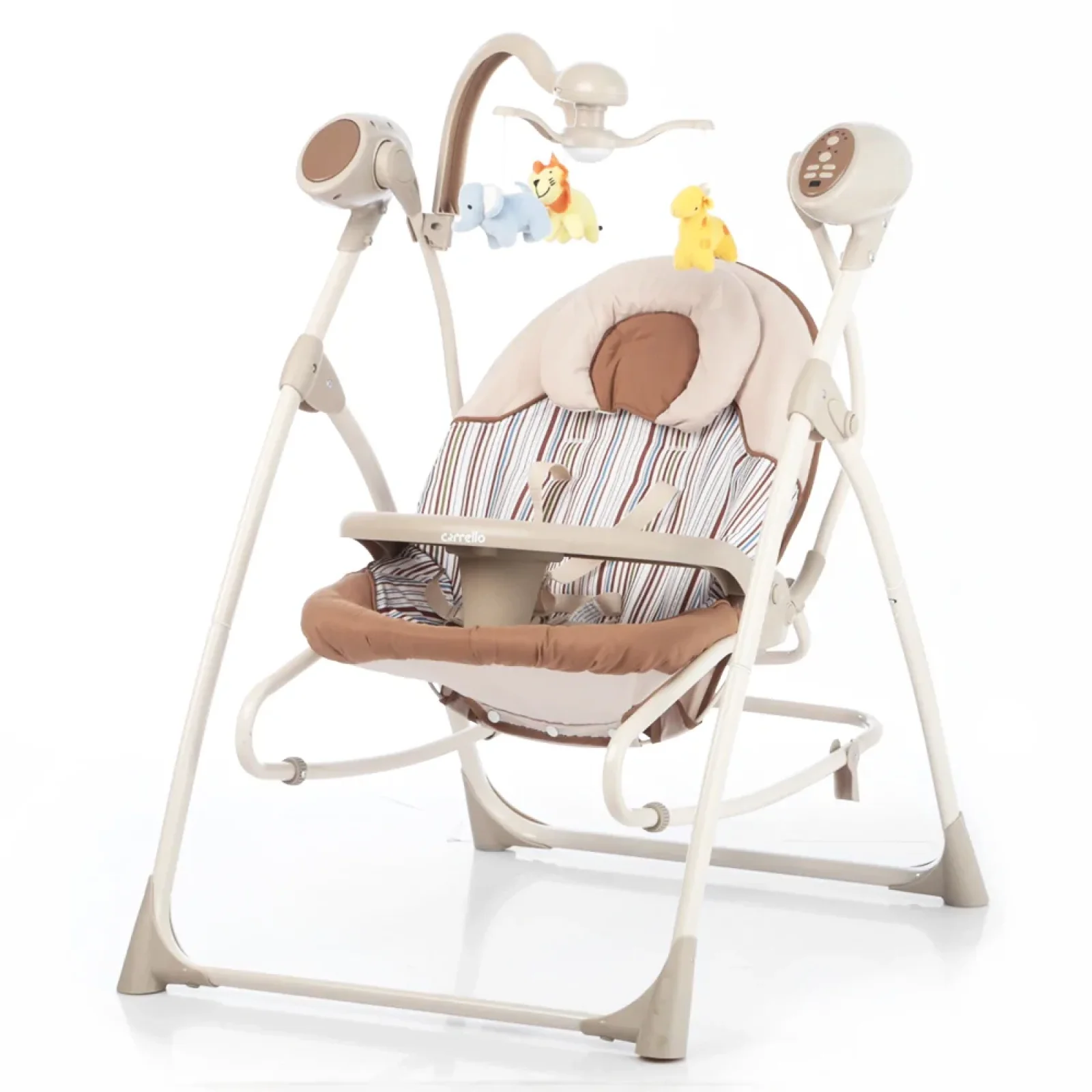 Колиска-гойдалка CARRELLO Nanny відмінно підійде для новонародженого малюка. М'який додатковий підголівник забезпечить комфорт для дитини, а п'ятиточкові ремені подбають про його безпеку. Так само це крісло має набір розваг: обертовий музикальний мобіль, 16 приємних мелодій і 5 звуків природи з регулюванням гучності, столик з обмежувачем. Для більш зручного користування, крісло обладнане таймером на 15, 30, 60 хвилин і пультом дистанційного керування. Крісло виконане з високоякісних матеріалів. Міцна конструкція забезпечує хорошу стійкість, при компактних розмірах Розміри ящика - 51,5*68*13,5 см