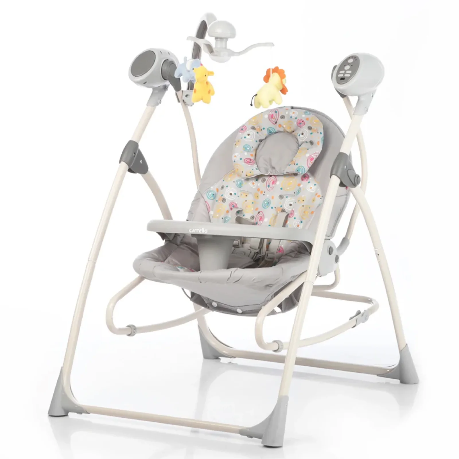 Колиска-гойдалка CARRELLO Nanny відмінно підійде для новонародженого малюка. М'який додатковий підголівник забезпечить комфорт для дитини, а п'ятиточкові ремені подбають про його безпеку. Так само це крісло має набір розваг: обертовий музикальний мобіль, 16 приємних мелодій і 5 звуків природи з регулюванням гучності, столик з обмежувачем. Для більш зручного користування, крісло обладнане таймером на 15, 30, 60 хвилин і пультом дистанційного керування. Крісло виконане з високоякісних матеріалів. Міцна конструкція забезпечує хорошу стійкість, при компактних розмірах Розміри ящика - 51,5*68*13,5 см