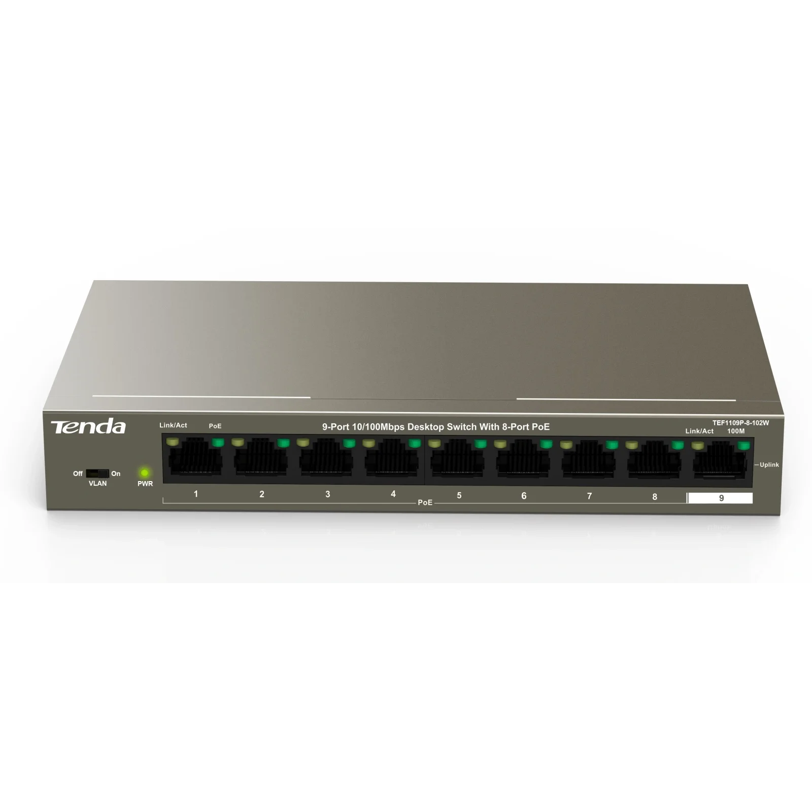 Оснащений 9-ма портами 10/100 Мбіт/с. RJ45. Порти 1-8 підтримують стандарт IEEE802.3af (максимальна вихідна потужність PoE – 15,4 Вт) та стандарт 802,3at (максимальна вихідна потужність PoE: 30 Вт). Комутатор пропонує максимальну вихідну потужність PoE 92 Вт та забезпечує потужність для обміну даними з точками доступу, IP-камерами та IP-телефонами через кабелі CAT5e. Також оснащений такими режимами як Standard та VLAN. Таким чином, TEF1109P-8-102W є ідеальним рішенням для малих та середніх підприємств, готелів та офісів для здійснення HD-спостереження та розгортання бездротових мереж.