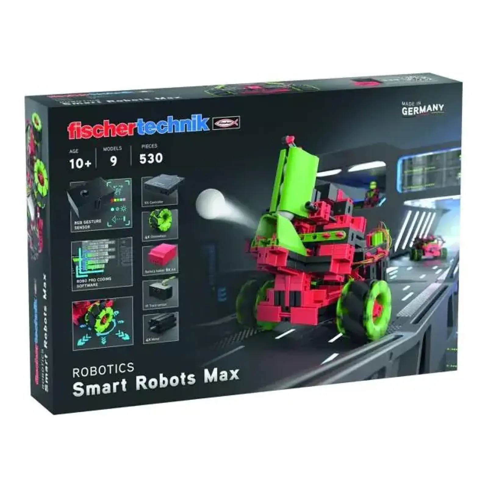fischertechnik Smart Robots Max працює з контролером fischertechnik RX та програмним забезпеченням ROBO Pro Coding, щоб оживити 9 захоплюючих моделей. Графічне програмне забезпечення не залежить від жодної конкретної операційної системи та може використовуватися на мобільних пристроях. Від простих моделей для початківців до різноманітних роботів на колесах і кумедного танцюючого робота – тут кожен знайде щось для себе. Однією з головних переваг цього набору є омніколеса, які приводяться в дію чотирма двигунами і дозволяють роботу рухатися в будь-якому напрямку. Датчик руху, датчик жестів і кнопка дають змогу створювати та програмувати різноманітних захоплюючих роботів, які просто чекають, поки розробники та винахідники відправлять їх у нову пригоду.