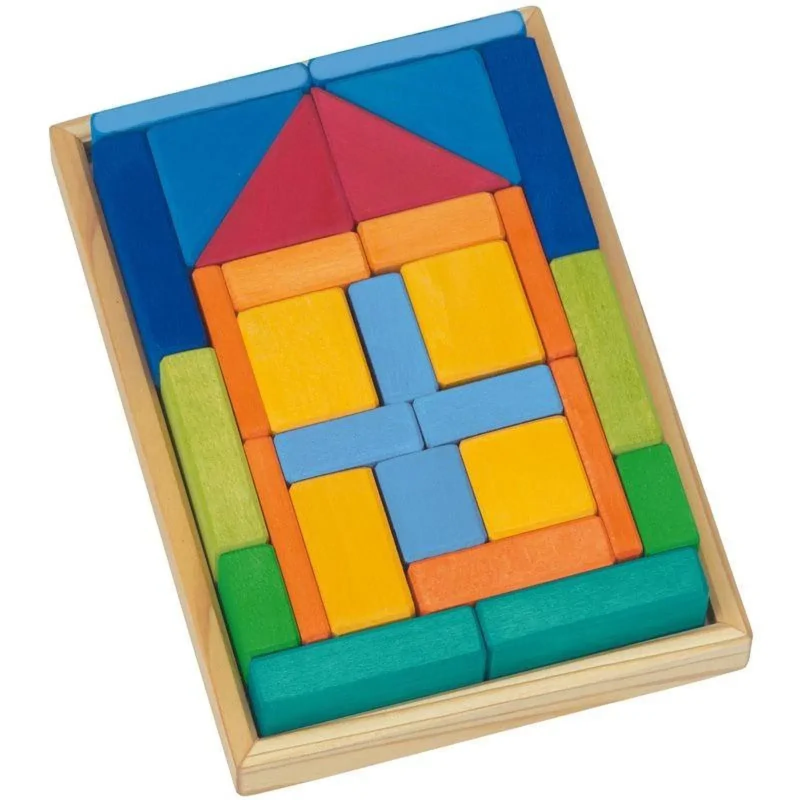 Конструктор Будинок побудований з натурального дерева, деталі пофарбовані в різні кольори. Конструктор складається з 29 елементів. Малюк за допомогою контруктор зможе зібрати різні споруди, в тому числі будинки в декількох варіаціях, міняючи місцями деталі.