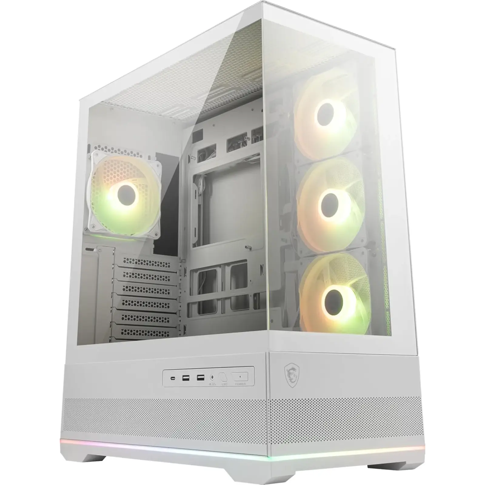 Фронтальна панель корпусу обладнана з урахуванням найвищих стандартів продуктивності та зручності користувача. На передній частині розташований надшвидкий порт USB Type C версії USB 3.2 Gen 2х2, що ідеально підходить для блискавичної передачі даних із зовнішніх накопичувачів, а також два порти USB 3.2 Gen 1 та комбінований роз'єм для ігрової гарнітури. Можливості зберігання даних дозволяють гнучко налаштувати систему під власні потреби завдяки двом відсікам для накопичувачів 2.5 дюйма та двом для класичних жорстких дисків 3.5 дюйма. MSI MAG Pano 110R PZ White — це ідеальне поєднання панорамного стилю, інноваційних технологій прихованого підключення дротів та безмежної потужності для створення ПК, який буде викликати захоплення у кожного.
