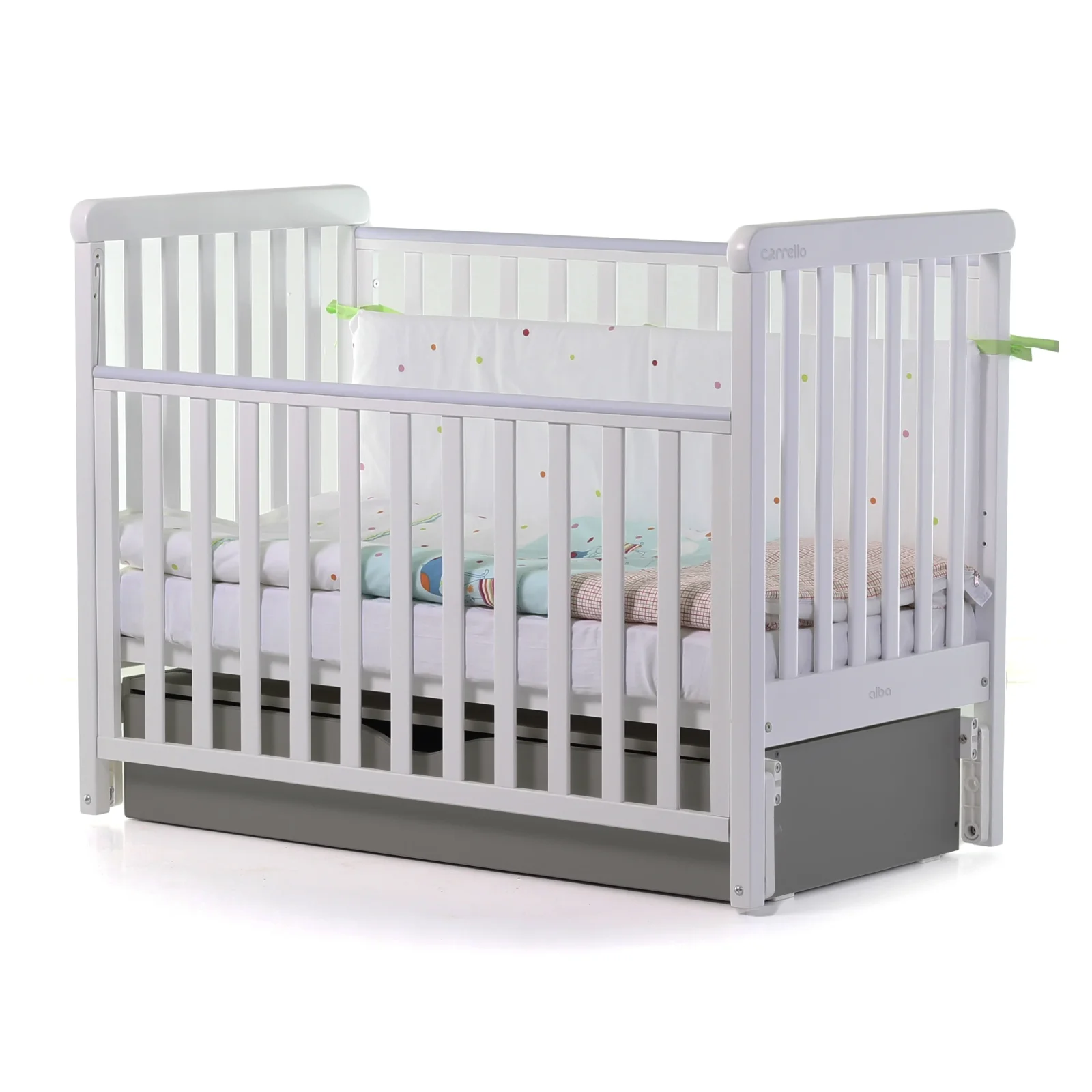Матеріал: бук Розмір спального місця: 120*60 см Габаритні розміри: 127*68,5*94,5 см - Механізм укачування: маятник поздовжній (відтворює рух заколисування на руках) - три рівні установки підматрацника - дно ліжечка виготовлено з ортопедичних ламелей, які забезпечують достатню вентиляцію матраца і постільної білизни - рухома бокова стінка з надійним механізмом опускання (може опускатися та зніматися повністю, полозки сховані, фіксація у верхньому і нижньому положенні при її опусканні/підніманні) - можливість трансформації ліжечка в дитячий диванчик (для цього потрібно зняти бокову рухому стінку) - захисна накладка-гризун на верхній частині боковин, яка захищає ясна дитини - всі деталі ліжечка мають безпечні округлі форми і поліровані поверхні - сертифіковані фарби і лаки на водній основі, з додаванням іонів срібла Розміри ящика: 122*74*18,5 см Короб маятникового механізму: Габаритні розміри: 120*52,3*21,6 см 2 зони зберігання: 48*51*12 см (кожна) Розміри ящика: 132*59*5,5 см