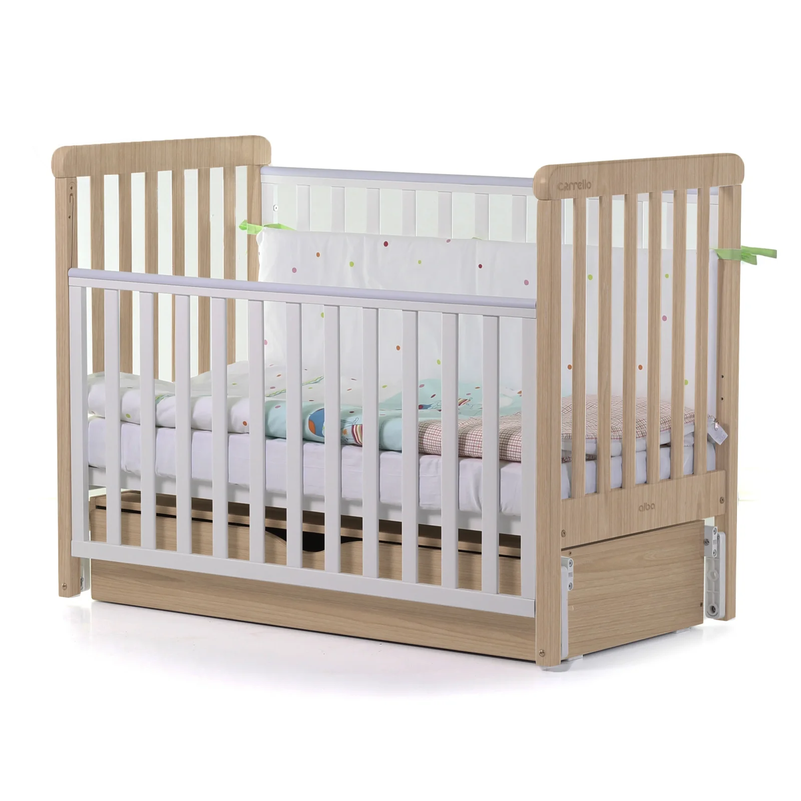 Матеріал: бук Розмір спального місця: 120*60 см Габаритні розміри: 127*68,5*94,5 см - Механізм укачування: маятник поздовжній (відтворює рух заколисування на руках) - три рівні установки підматрацника - дно ліжечка виготовлено з ортопедичних ламелей, які забезпечують достатню вентиляцію матраца і постільної білизни - рухома бокова стінка з надійним механізмом опускання (може опускатися та зніматися повністю, полозки сховані, фіксація у верхньому і нижньому положенні при її опусканні/підніманні) - можливість трансформації ліжечка в дитячий диванчик (для цього потрібно зняти бокову рухому стінку) - захисна накладка-гризун на верхній частині боковин, яка захищає ясна дитини - всі деталі ліжечка мають безпечні округлі форми і поліровані поверхні - сертифіковані фарби і лаки на водній основі, з додаванням іонів срібла Розміри ящика: 122*74*18,5 см Короб маятникового механізму: Габаритні розміри: 120*52,3*21,6 см 2 зони зберігання: 48*51*12 см (кожна) Розміри ящика: 132*59*5,5 см