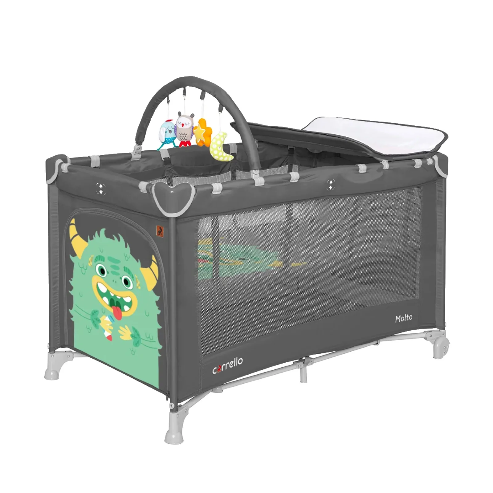 -розмір 125 * 65 * 79 см -два рівні положення матраца -барвистий малюнок на матраці і на боковому віконці -арка з чотирма м'якими іграшками -зручний пеленальний столик -практичні бічні кишені для дрібних предметів -двоколірні пластикові куточки -2 колеса -велике віконце на змійці -жорстке дно -сумка-переноска в комплекті Розміри ящика - 23.5 * 22 * 75см