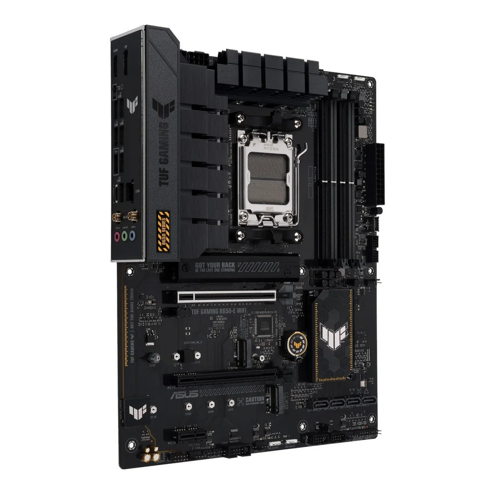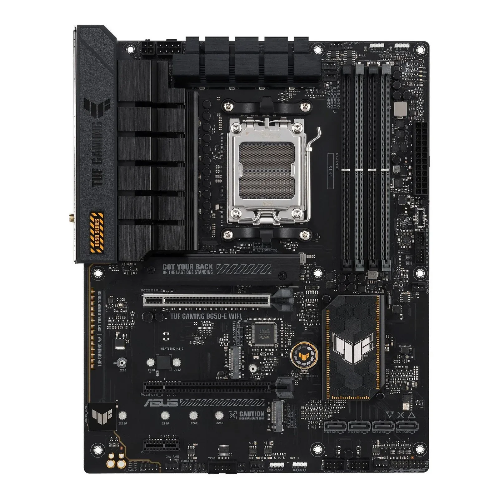 Материнська плата ASUS TUF GAMING B650-E WIFI розкриває всі основні можливості новітньої платформи AMD AM5 для процесорів AMD Ryzen, доповнюючи їх ексклюзивними геймерськими функціями й надійністю, перевіреною часом. Відбірна елементна база, удосконалена система живлення та сумісність із різними системами охолодження – ця материнська плата надає все для того, щоб отримати гарантовану й максимальну швидкодію в іграх. Материнські плати TUF GAMING проходять ретельні випробування, щоб гарантувати надійну роботу в різних умовах. Плати серії TUF GAMING прикрашають прості геометричні елементи дизайну, які відображають надійність і стабільність, властиві серії пристроїв TUF Gaming. Ця платформа забезпечує потужність і можливості підключення, яких вимагають передові комп’ютерні застосунки зі штучним інтелектом.