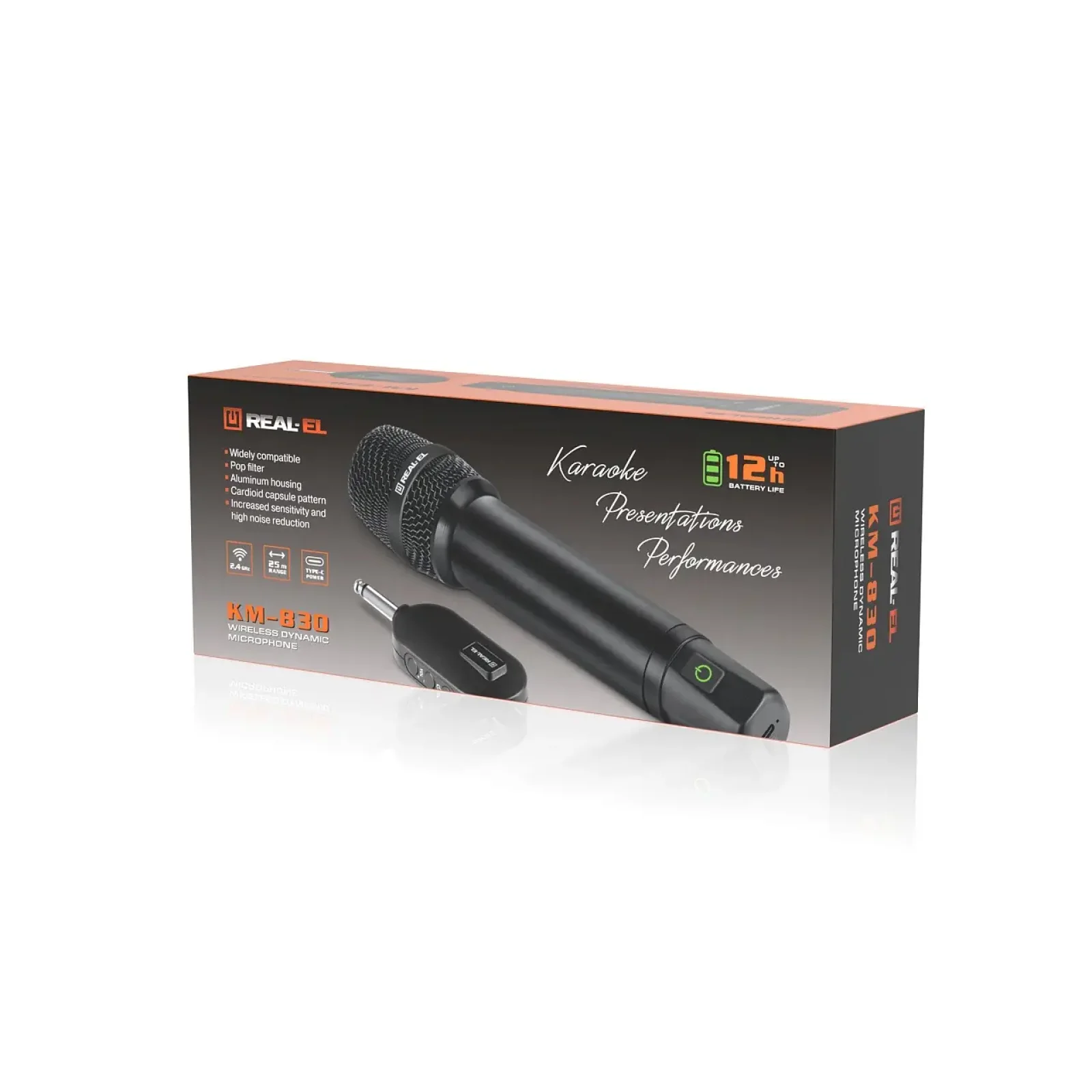 Співай, виступай, запалюй – без дротів та без обмежень. REAL-EL KM-830 - бездротовий динамічний мікрофон для караоке, вечірок, виступів та домашніх концертів.