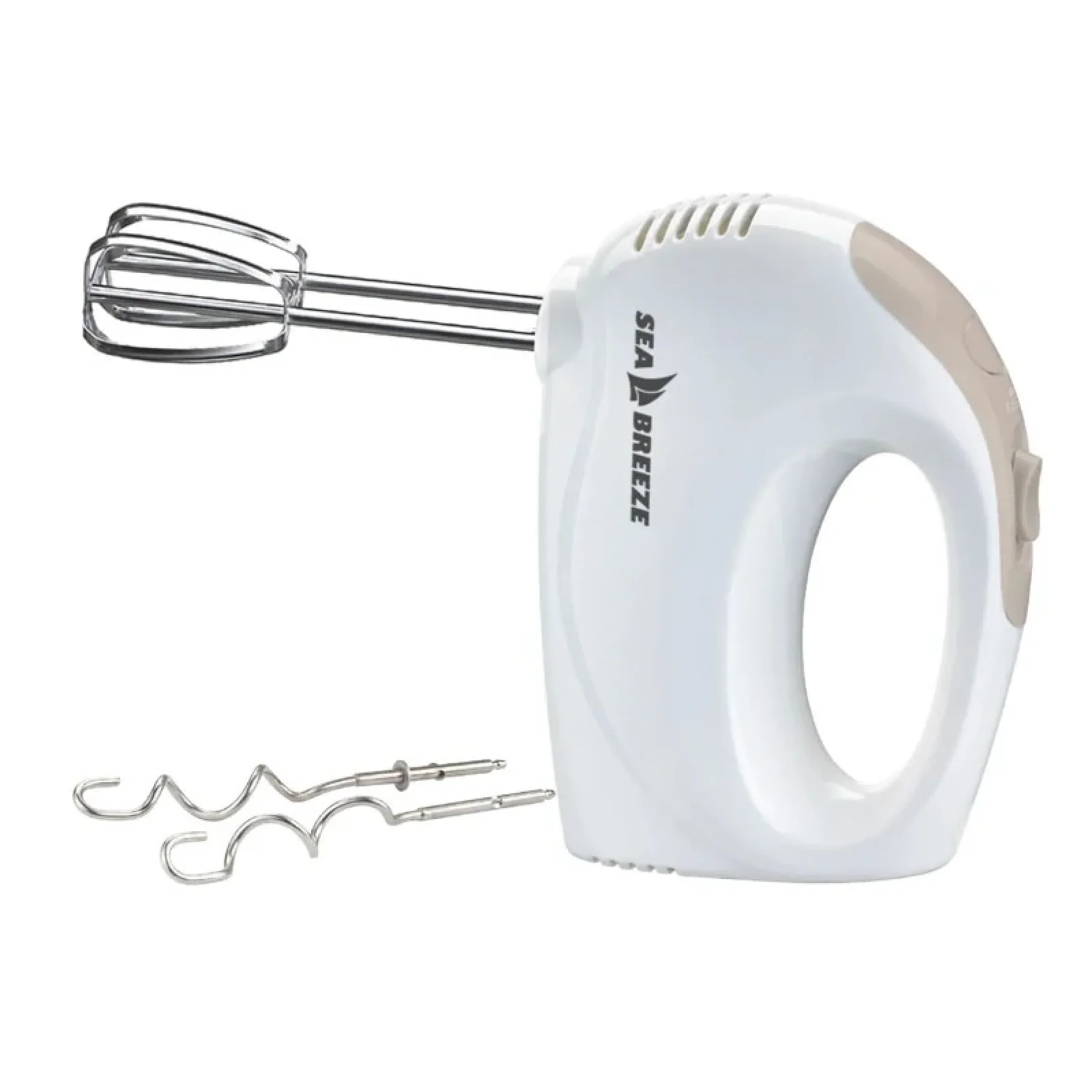 У комплекті з SeaBreeze SB-050 постачаються два типи насадок із високоякісної нержавіючої сталі: класичні вінчики для збивання рідких мас (яєць, вершків, легкого тіста) та спеціальні гаки для замішування густішого тіста. Насадки легко знімаються одним натисканням кнопки, що робить використання приладу максимально комфортним.