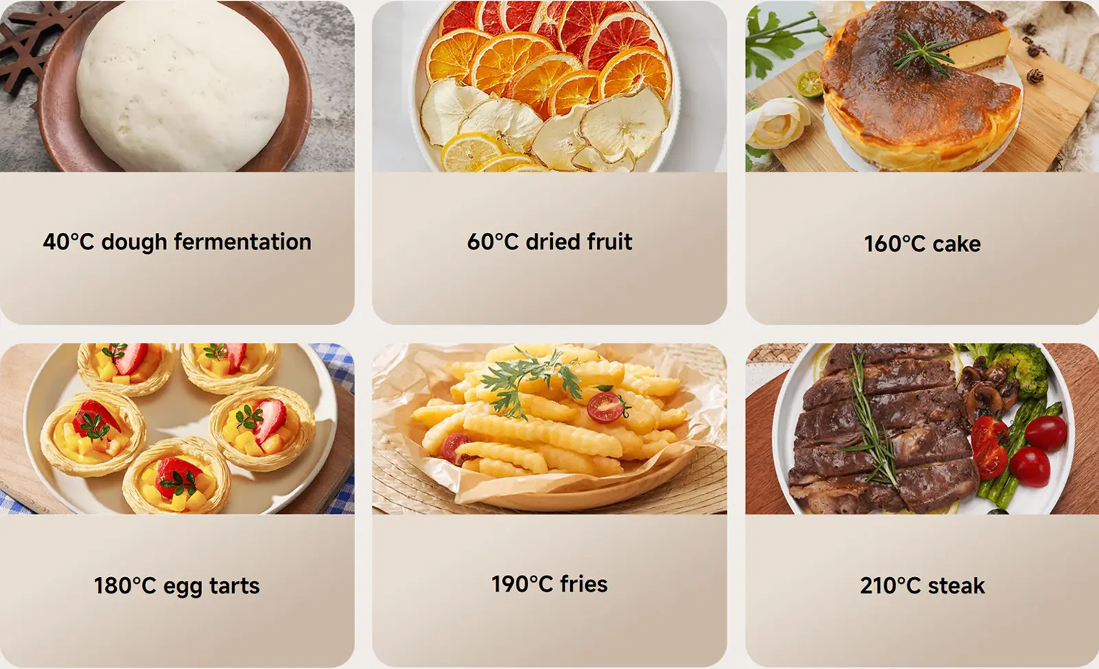 Діапазон температур від 40 до 210°C дозволяє готувати практично все — від сушіння фруктів до запікання м’яса. Сім автоматичних програм допоможуть легко обрати оптимальний режим для картоплі фрі, курки, овочів, риби чи десертів, а користувацький режим “M” дає можливість самостійно задати параметри часу й температури.