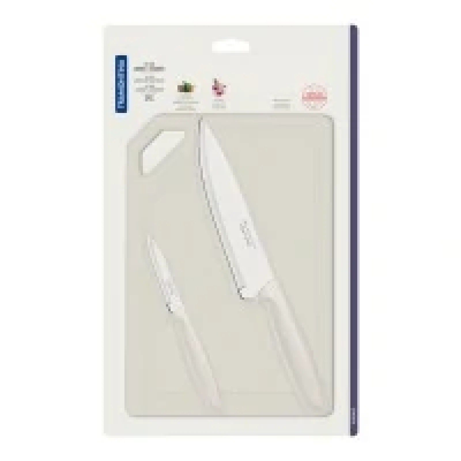 Набор ножей Tramontina Plenus light grey, 3 предмета (23498/314) Комплектация: Нож Шеф 1 шт-178 мм. Нож для овощей 1 шт-76 мм. Пластиковая доска 1 шт. Материал лезвия: нержавеющая сталь AISI 420. Материал рукоятки: полипропилен. Режущая кромка ножа: гладкая. Упаковка: индивидуальный блистер.