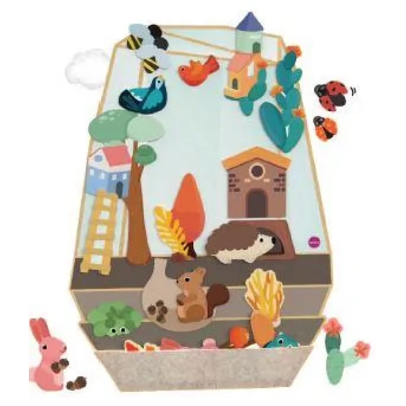 Єжи і білки, птиці і бджоли з кактусами і жолудями, рослинами і деревами. Цей сад в банку - кумедна і інтерактивна гра-постановка з двома наборами фігур, що зображають два сезони; навесні і восени. Він надає величезні можливості для створення різних сцен, які відкриють