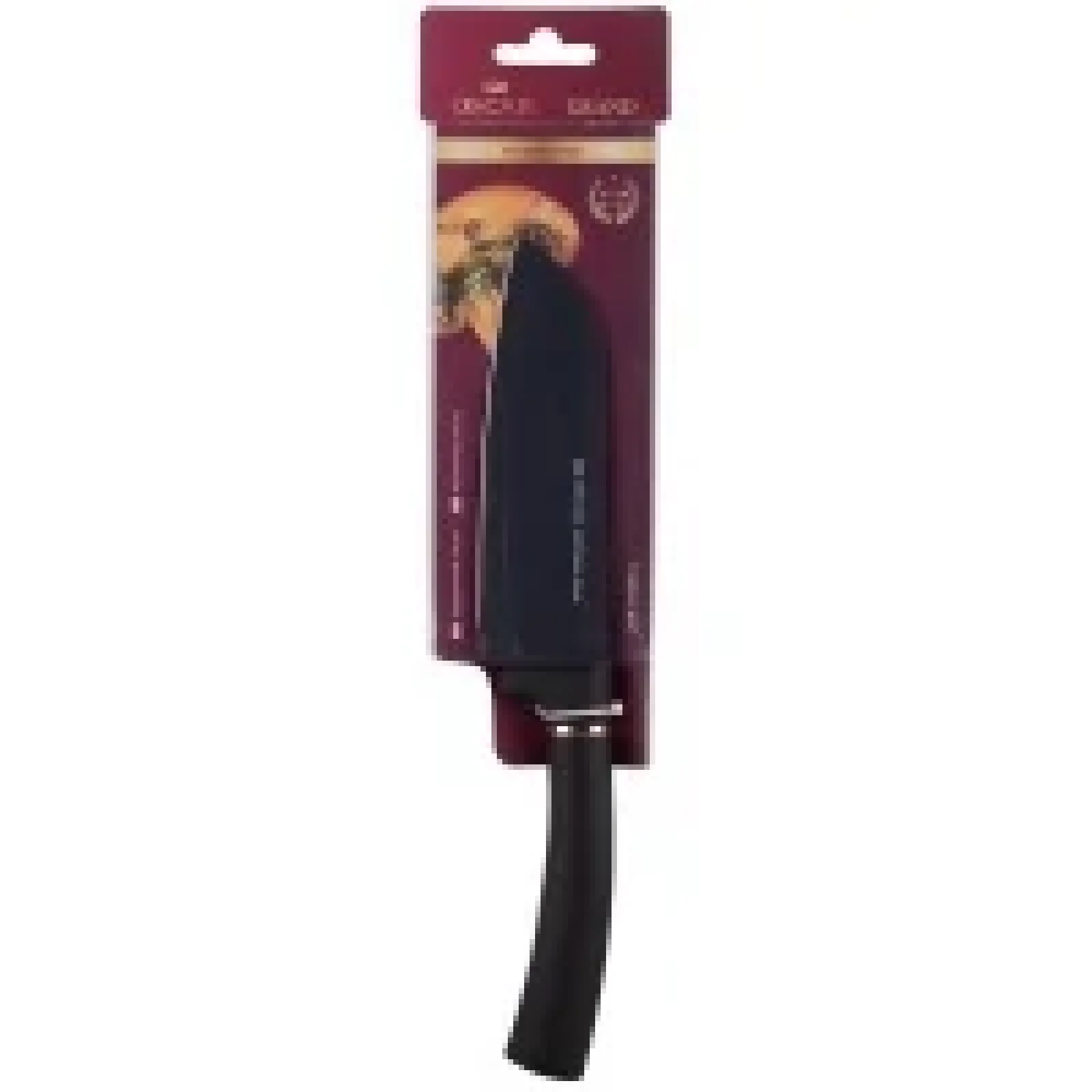 Нож сантоку Oscar Grand, 13 см (OSR-11000-5) Материал лезвия: нержавеющая сталь с черным покрытием, которое предотвращает прилипание продуктов к лезвию. Материал рукоятки: полипропилен с покрытием из термостойкой резины и бронзовой вставкой из ABS. Soft-touch покрытие на рукоятке обеспечивает антискользящий эффект. Конструкция ручки способствует правильному и удобному использованию. Цвет: черный/бронзовый. Режущая кромка ножа: гладкая. Упаковка: блистер.