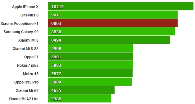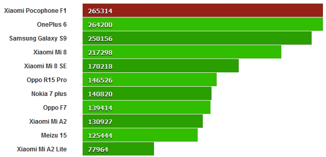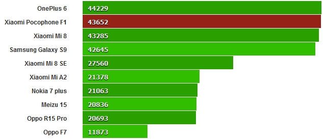 Antutu є однією з найпопулярніших програм для тестування продуктивності пристроїв, і тут Pocophone F1 отримав таку ж оцінку, як і OnePlus 6, так що, це одні з кращих показників досі.