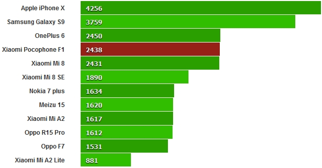 У багатоядерному тестуванні Poco F1 також отримав оцінку, подібну іншим флагманів з процесором S845.
