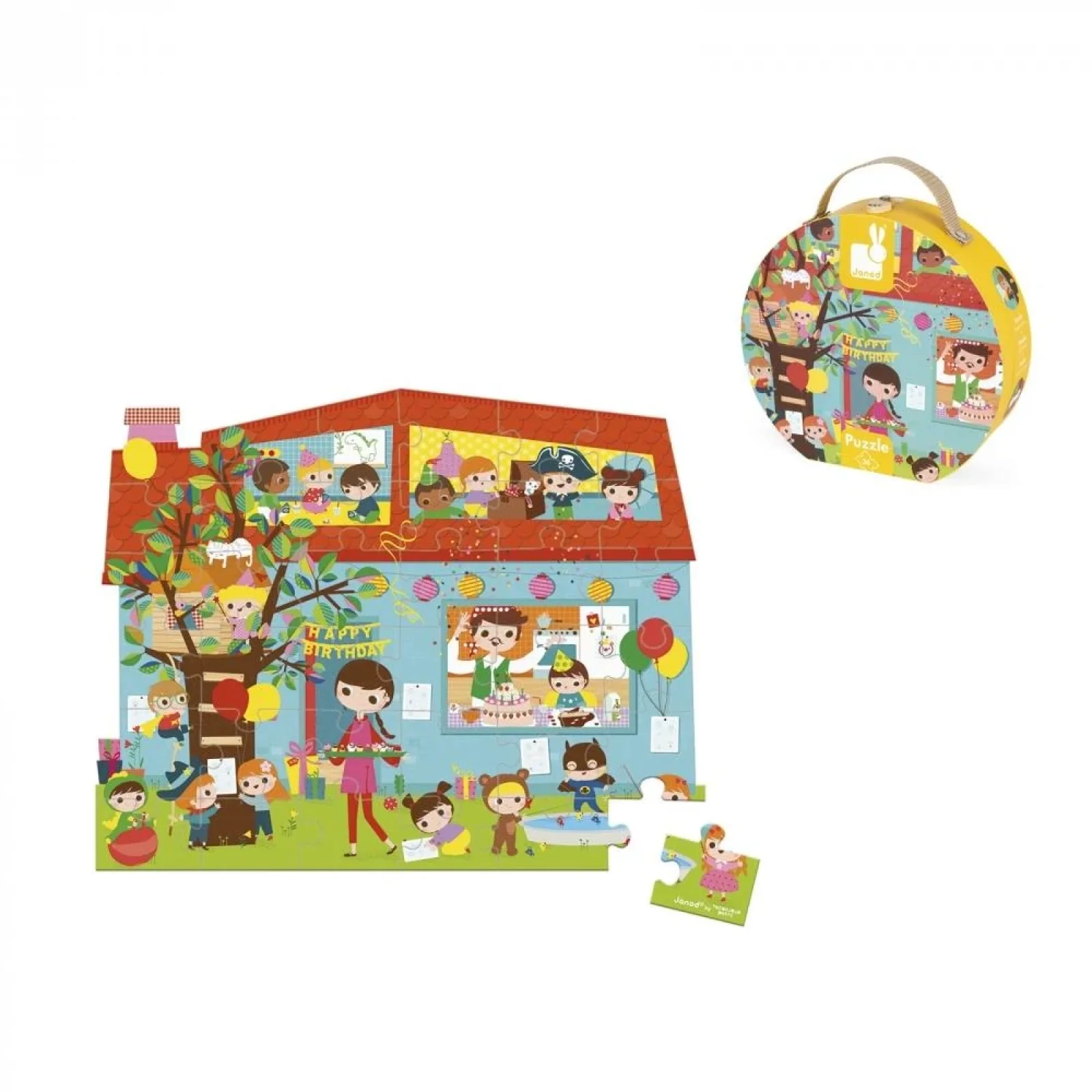 Пазл у яскравій, якісній коробці-валізі з ручкою – для дітей, віком від 4 років. Якісна іграшка бренду Janod виготовлена з безпечних, надійних матеріалів. І коробка, і деталі пазлу – картонні. При цьому він цупкий, не гнеться, пазл можна збирати нескінченну кількість разів і деталі не деформуються. Зібрана картинка не прямокутна, як більшість пазлів, вона у формі будиночка. Малюнок чудово відповідає темі «день народження», а тому – це чудовий подарунок на свято.