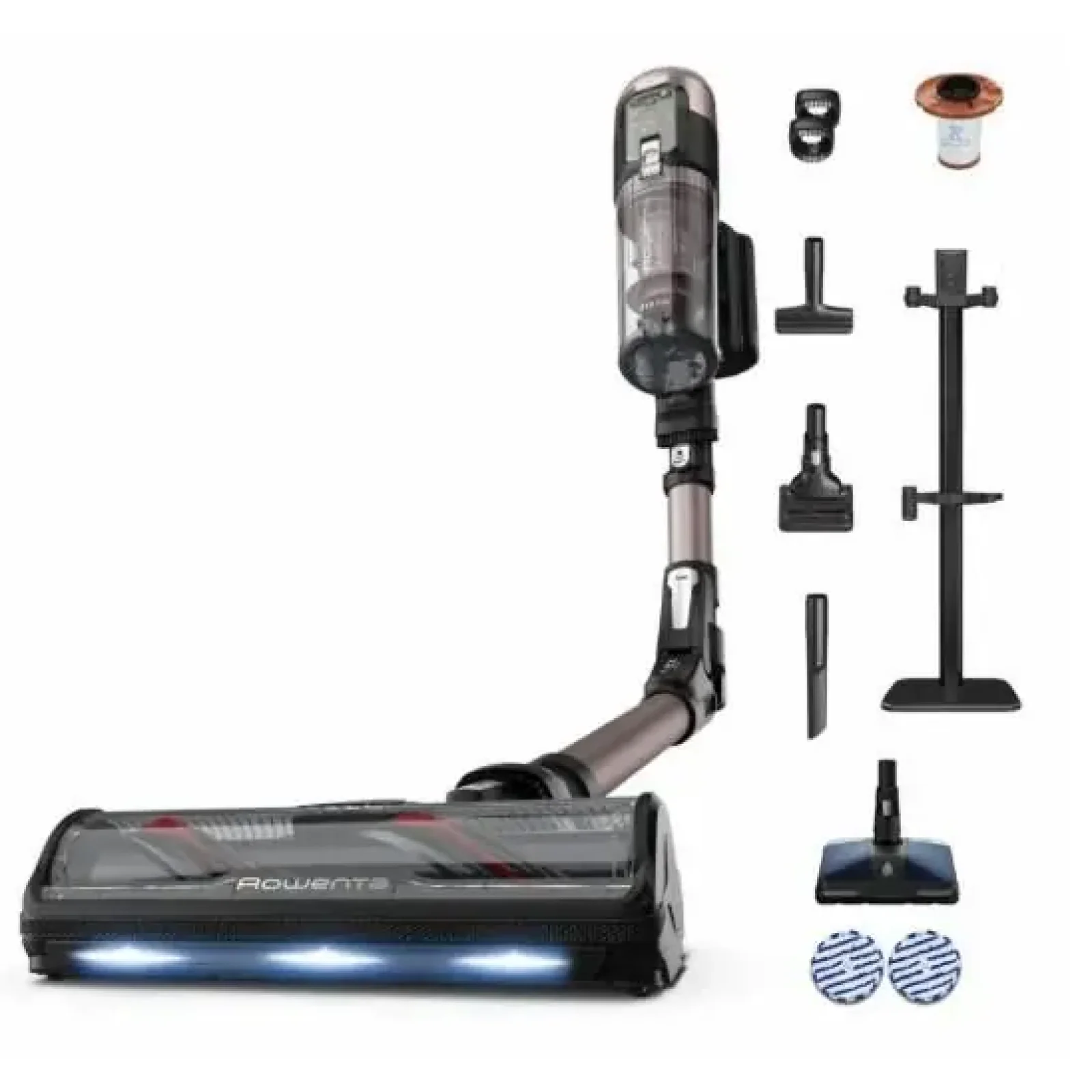 Акумуляторний пилосос, Покращена турбощітка Neo, Активна миюча насадка Aerospin AQUA з LED підсвіткою, 4 мікрофібри для вологого прибирання, щітка Animal Turbo, Щітка для меблів, Щілинна насадка, 2 щітки Easy Вrush, Док-станція для зберігання пилососа та насадок, додатковий фільтр, Інструкція, Гарантійний талон
