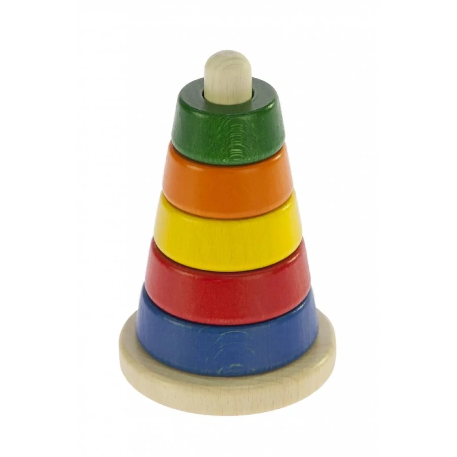 Пірамідка – найпопулярніша іграшка для дітлахів. Розвиваючий комплект оформлений у фірмову картонну упаковку. Пірамідка має конічну форму та складається із 6 деталей, її висота – 12 см. Усі деталі вироблені із натурального дерева, їх приємно тримати у руках. Кольорові фарби на водній основі, весь комплект – безпечний для здоров’я дитини. Така пірамідка рекомендована дітям від 1 року.