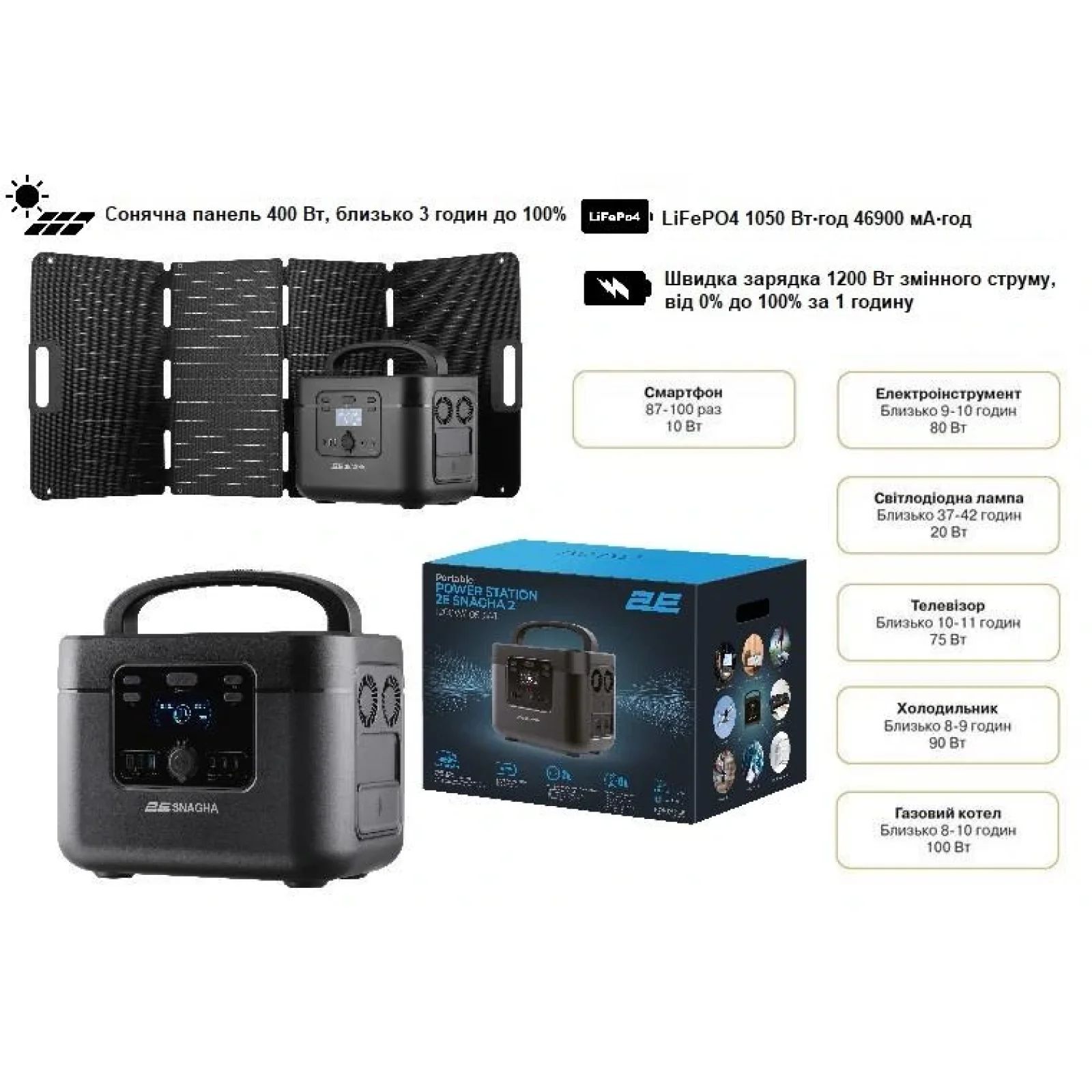 Портативна зарядна станція нового покоління 2Е SNAGHA 2 це оновлена та ще потужніша зарядна станція вже популярної 2Е SNAGHA. Номінальна потужність інвертора з чистою синусоїдою в 1200Вт і ємністю акумулятора LiFePO4 в 1050 Вт/год володіє інноваційними функціями і технологіями що робить її відмінним джерелом резервного або альтернативного живлення! Сучасні, безпечні та довговічні елементи живлення типу LiFePO4 (Клас А) забезпечать довговічність роботи навіть при інтенсивному використанні ПаверСтейшена 2Е SNAGHA 2. Дві розетки змінного струму 220В типу Schuko із заземленням значно розширює кількість видів споживачів, що можна заживити.