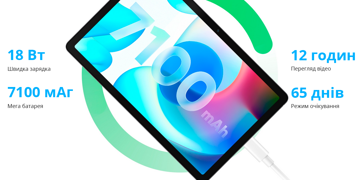 Акумулятор 7100 мАг забезпечує потужність поза очікуванням – це 12 годин безперервного перегляду відео та достатньо, щоб залишити Realme Pad у режимі очікування на 65 днів. Із швидкою зарядкою 18 Вт ваш планшет заряджається за короткий час та готовий до нових випробувань.