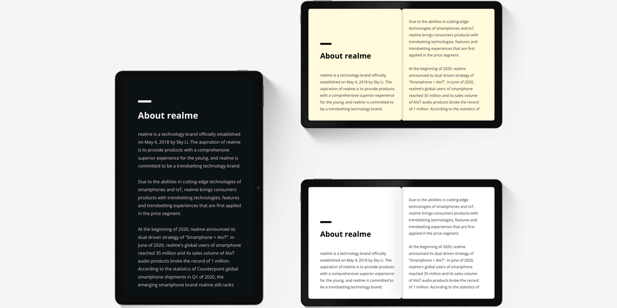 Режим Читання імітує текстуру сторінок книги. Темний режим піклується про комфорт ваших очей вночі. Нічний режим захищає ваші очі, зменшуючи яскравість до 2-х ніт, коли світло вимикається. Сонячний режим забезпечує чітке відображення на екрані, коли ви на дворі. І на додачу, є режим Комфорту для очей для зменшення втоми очей.