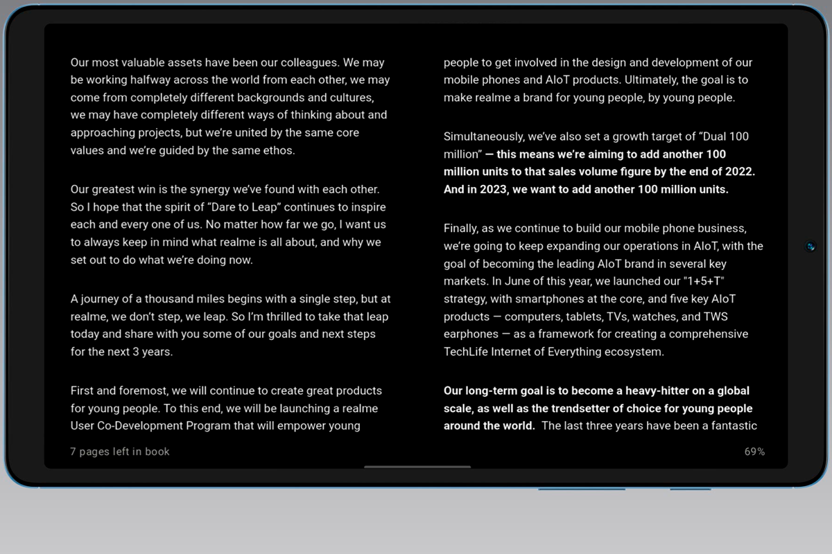Режим Eye Comfort знижує випромінювання синього світла, зменшуючи втому очей. У режимі читання насолоджуйтесь візуальним досвідом, схожим на сторінки книги. Уночі ввімкніть «Темний режим», щоб активувати більш м’який, темний інтерфейс, який допоможе уникнути різкого світла та подбати про ваші очі.