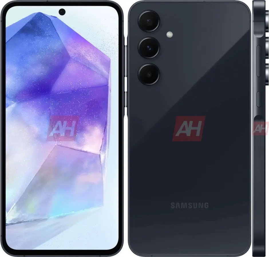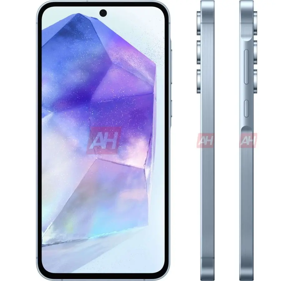 Рендери, люб’язно надані звітом Android Headlines, демонструє три кольори Samsung Galaxy A55: Awesome Iceblue, Awesome Lilac і Awesome Navy.