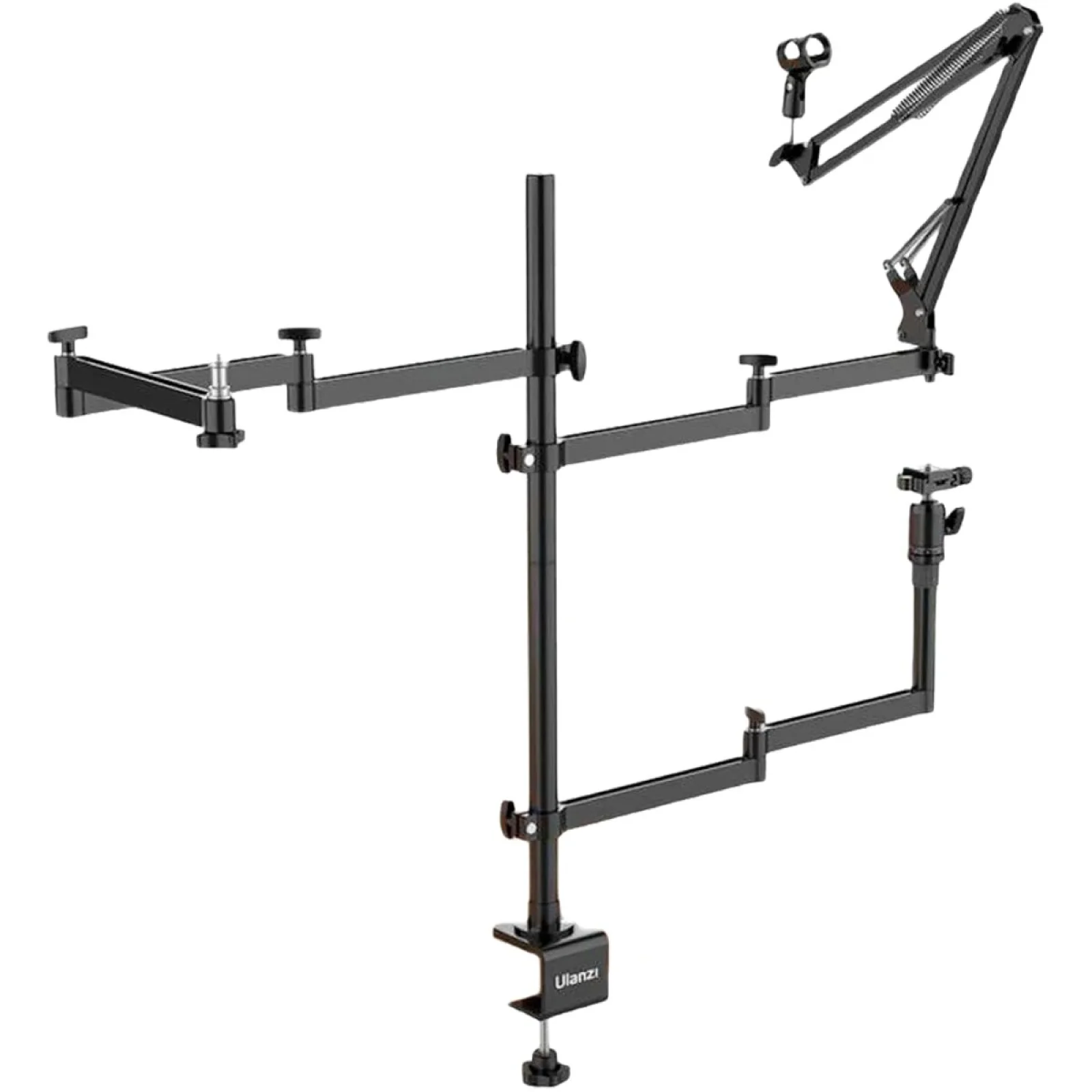 Ulanzi Universal Desktop Livestream Stand складається з центральної вертикальної стійки (заввишки 70 см) і трьох горизонтальних шарнірних утримувачів, які вільно переміщуються вгору і вниз. Кожен із трьох тримачів витримує навантаження до 2 кг і має унікальний дизайн для виконання різних функцій.