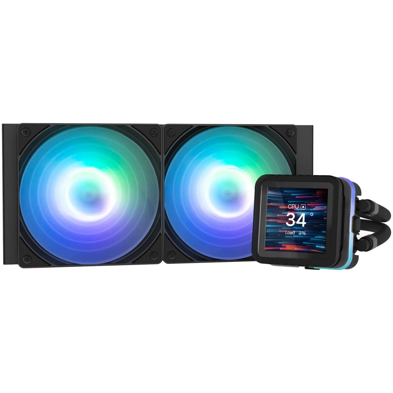 Два вентилятори розміром 120 x 120 x 25 мм із регулюванням обертів через PWM забезпечують оптимальний повітряний потік при швидкості від 600 до 2000 об/хв. Радіатор із алюмінію розміром 120 x 277 x 27 мм та компактний насос 72 x 72 x 65 мм гарантують стабільну циркуляцію рідини, а рівень шуму всього 29,7 дБ робить роботу системи комфортною навіть під високою продуктивністю.