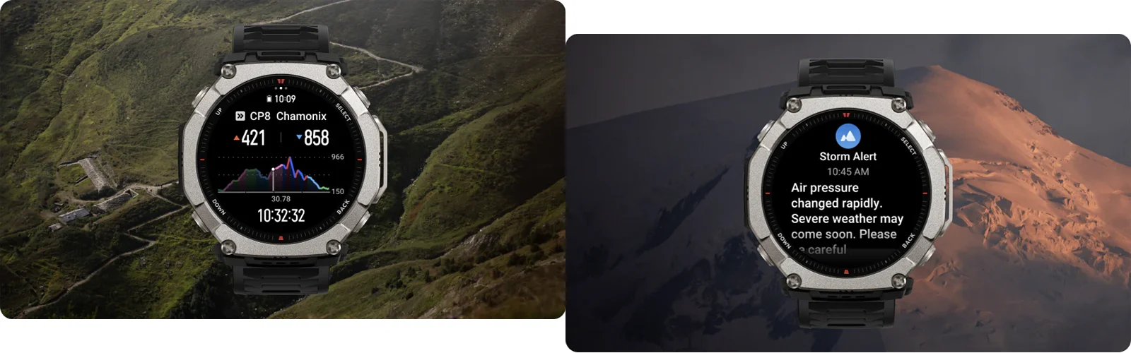 Використовуйте барометр та сповіщення про шторм, щоб відстежувати раптові зміни погоди та отримувати завчасні попередження. Підказки на великій висоті нагадають вам перевірити рівень кисню в крові під час крутих підйомів, щоб ви могли контролювати реакцію свого організму.