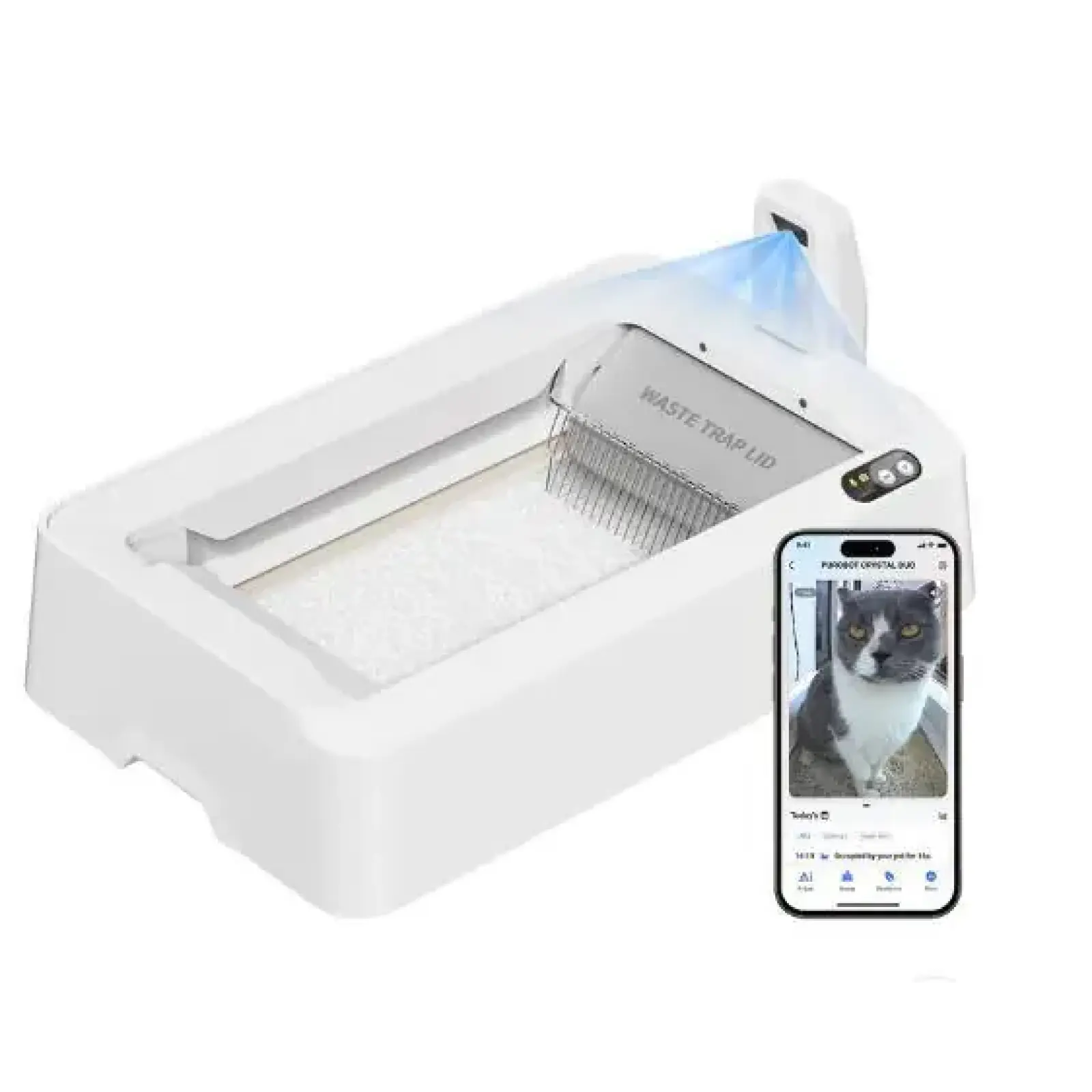Однією з ключових інновацій моделі стала вбудована камера зі штучним інтелектом. Вона дозволяє власнику спостерігати за котом у реальному часі через мобільний додаток. Камера фіксує відвідування туалету, записує активність тварини та допомагає відстежувати її поведінку. У домі з кількома котами система може розпізнавати різних тварин і вести окрему статистику використання лотка. Такі дані можуть бути корисними для раннього виявлення змін у поведінці, які іноді сигналізують про проблеми зі здоров’ям.