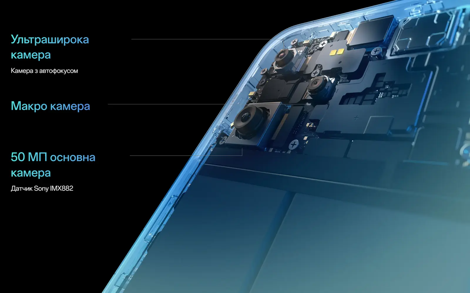50 MP, f/1.8, 26mm (ширококутна), цифровий автофокус, оптична стабілізація + 8 MP, f/2.2, 16mm, 112˚ (ультраширококутна), 1/4.0", 1.12µm, автофокус + 2 MP, f/2.4, (макро), Відео 4K@30fps, 1080p@30/60/120fps