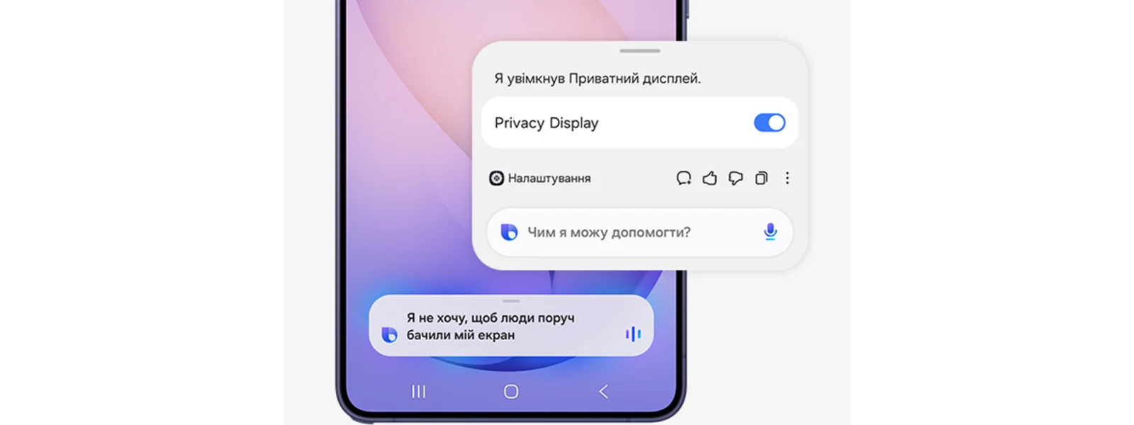 Потрібна допомога? Зверніться до Bixby. Це ваш персональний помічник для керування пристроєм, який навчить користуватися функціями та налаштовувати параметри для додаткової зручності. Якщо вам потрібні швидкі відповіді, система може виконати пошук в інтернеті, реагуючи природні, прості запити.