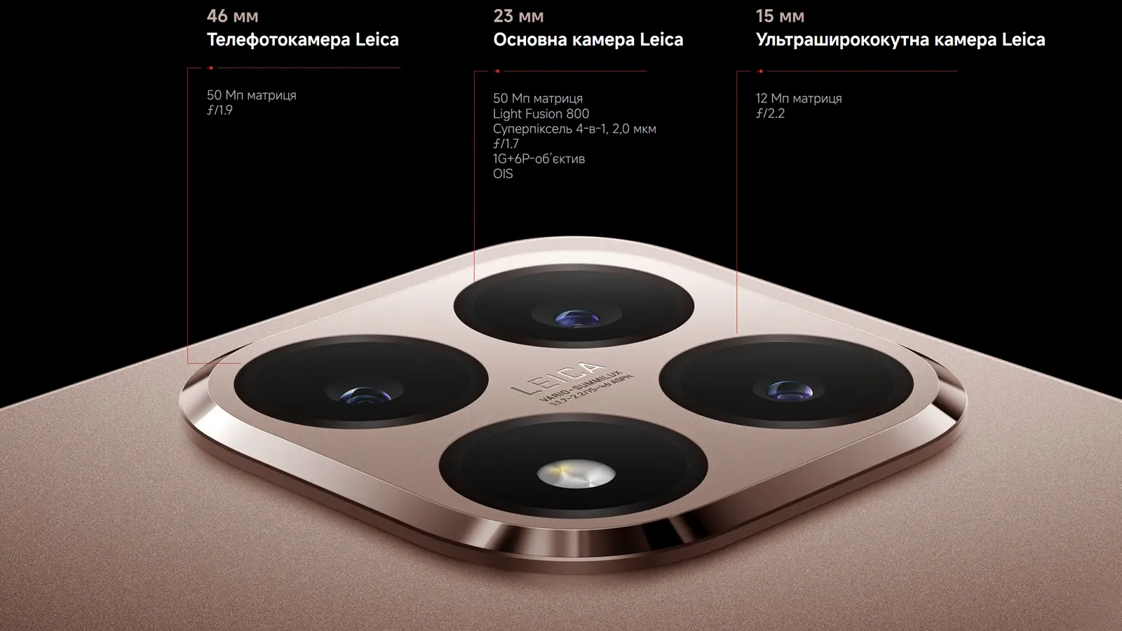 Телефото Leica з фокусною відстанню 46 мм передає емоції та перспективу портретів так, як їх бачить око, а ультраширокий модуль на 15 мм додає простору пейзажам і архітектурі.
