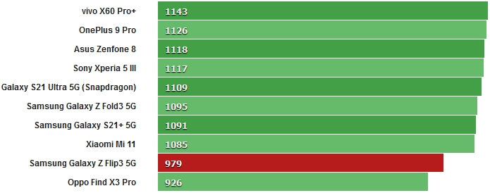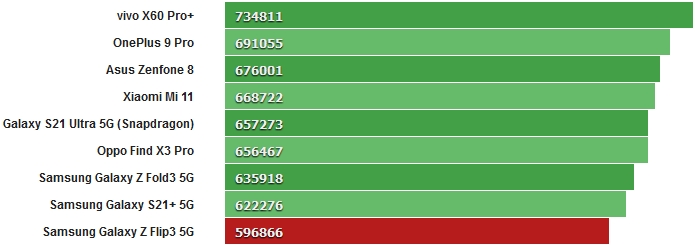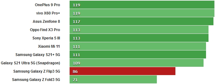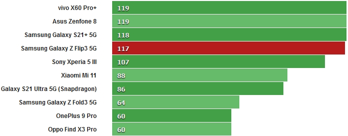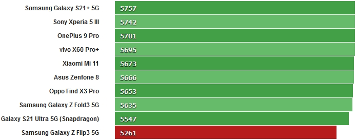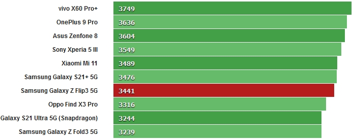 У бенчмарку GeekBench Galaxy Z Flip3 5G показав середні значення для SD888 в багатоядерному тесті і відносно низький результат в одноядерному тесті. Інша модель Galaxy S21 Ultra з чіпсетом Snapdragon більше відповідає конкурентам при тестуванні в одноядерному режимі.