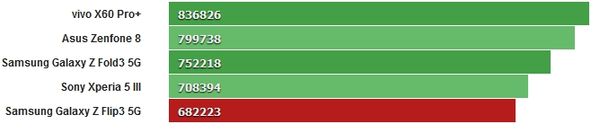 Antutu також не вказує Flip3 у вигідному світлі, і в 9-ій версії популярного тесту, даний смартфон отримує досить низькі оцінки, як для телефону з новітнім високопродуктивним Snapdragon. Аналогічна історія і в Antutu 8.