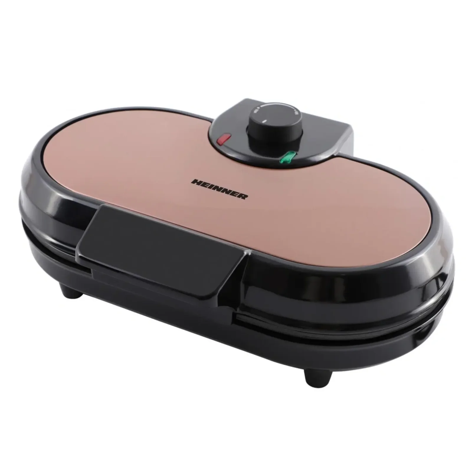 Корпус виконаний у елегантному чорному кольорі з мідними акцентами, що гармонійно вписується в сучасну кухню. Антипригарне покриття робочих панелей полегшує вилучення готових вафель без масла і спрощує очищення. Індикатор нагріву та готовності сигналізує про оптимальний момент для використання, а термоізольована ручка і ненагріваючі елементи забезпечують безпеку.