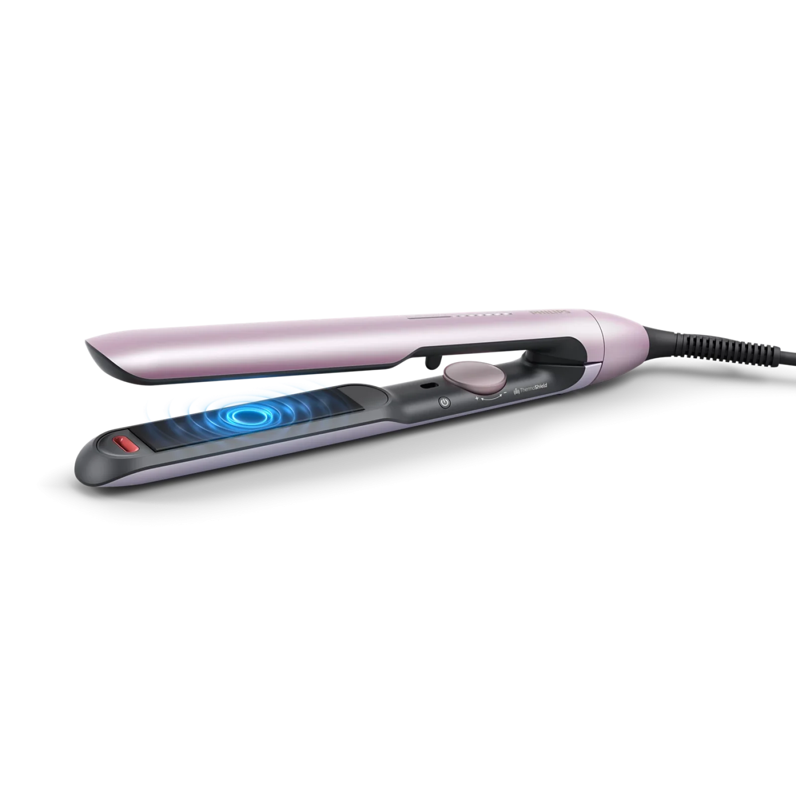 Інтелектуальна система розподілу тепла підтримує однакову температуру по всій поверхні пластин. Це дозволяє досягати рівномірної гладкості по всій довжині волосся без необхідності багаторазового проходу по одному пасму, що знижує теплове навантаження і зберігає здоровий вигляд волосся.