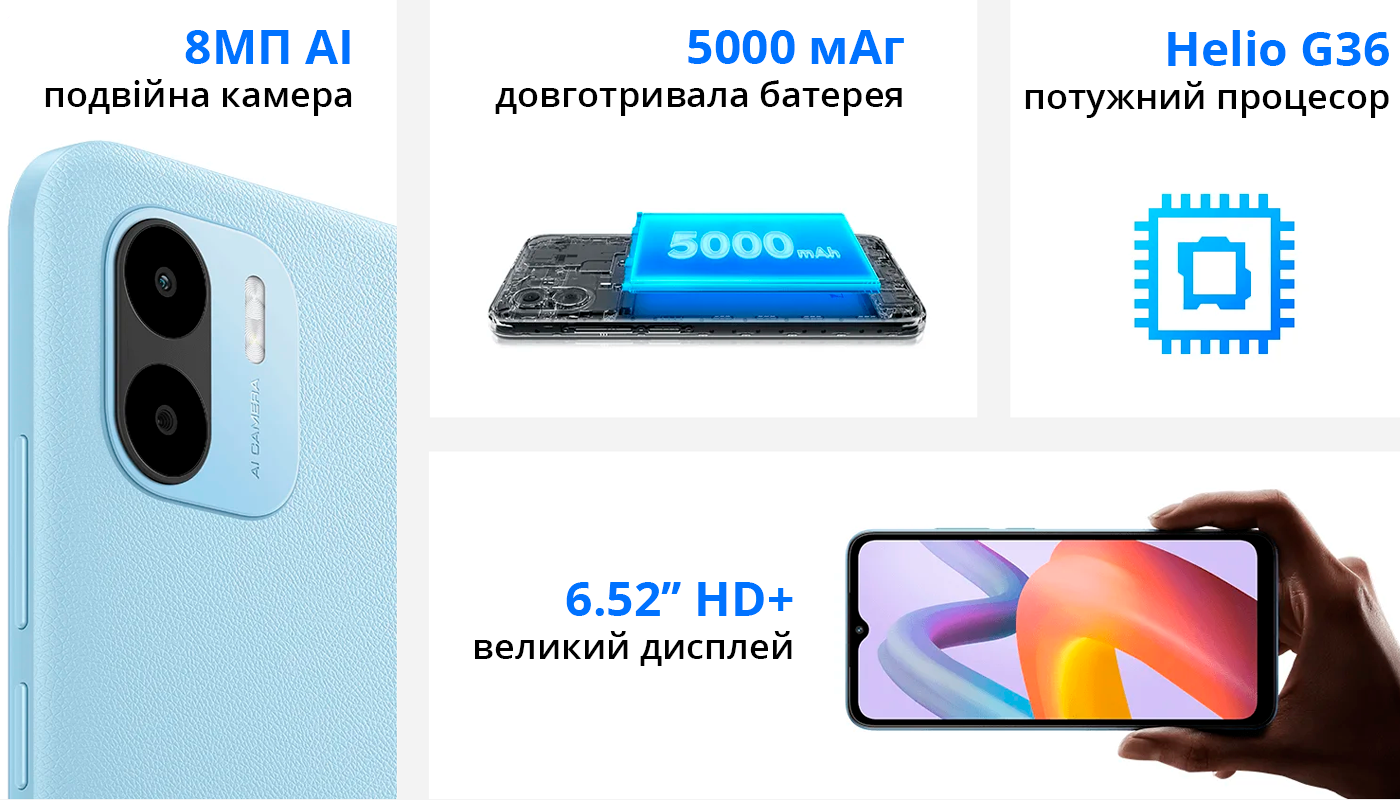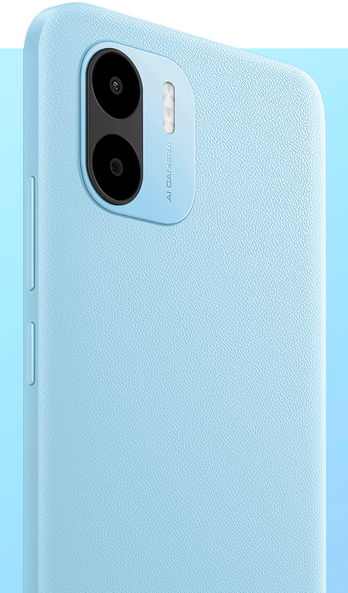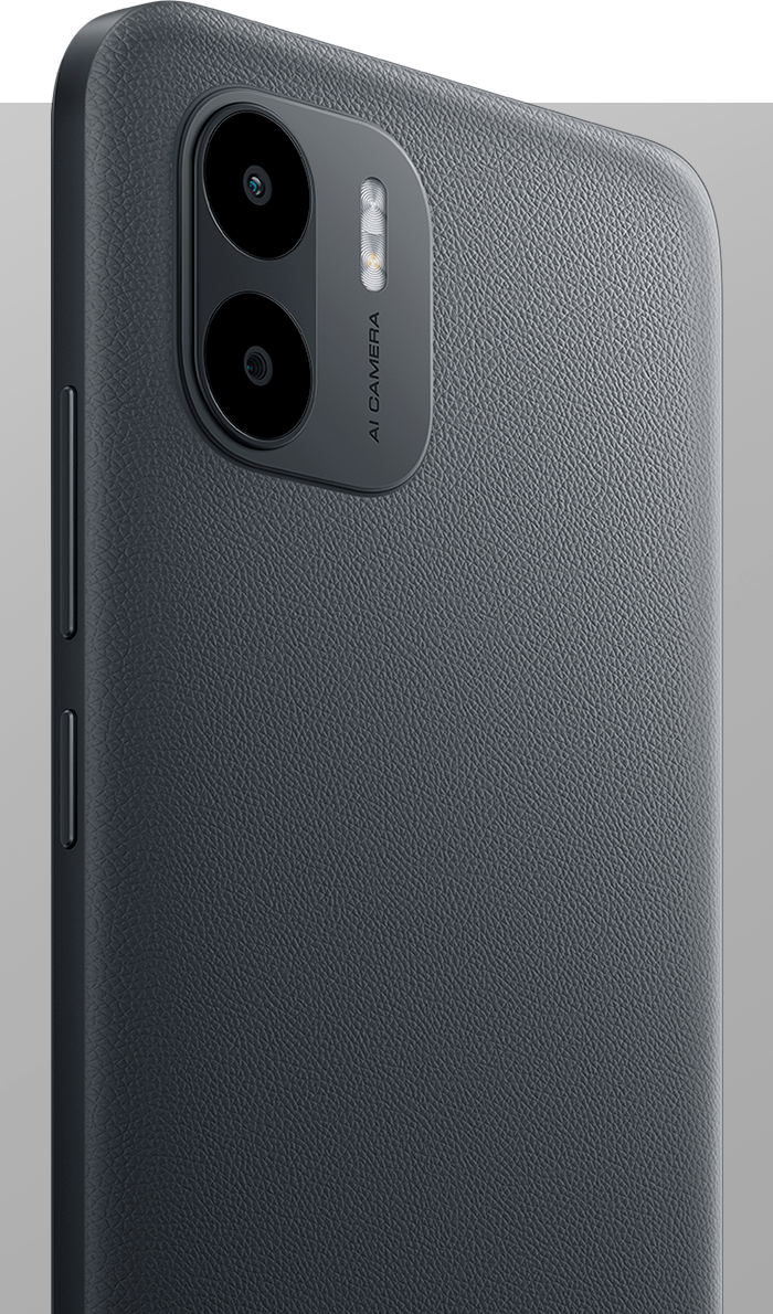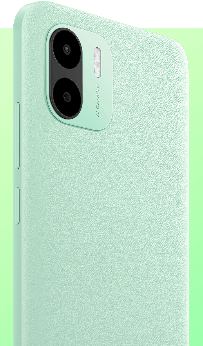Redmi A2 має модну плоску рамку та доступний в спокійних відтінках чорного, зеленого та блакитного кольорів. Текстурована задня панель має преміальний вигляд, стійка до плям від відбитків пальців і зручна для тривалого тримання.