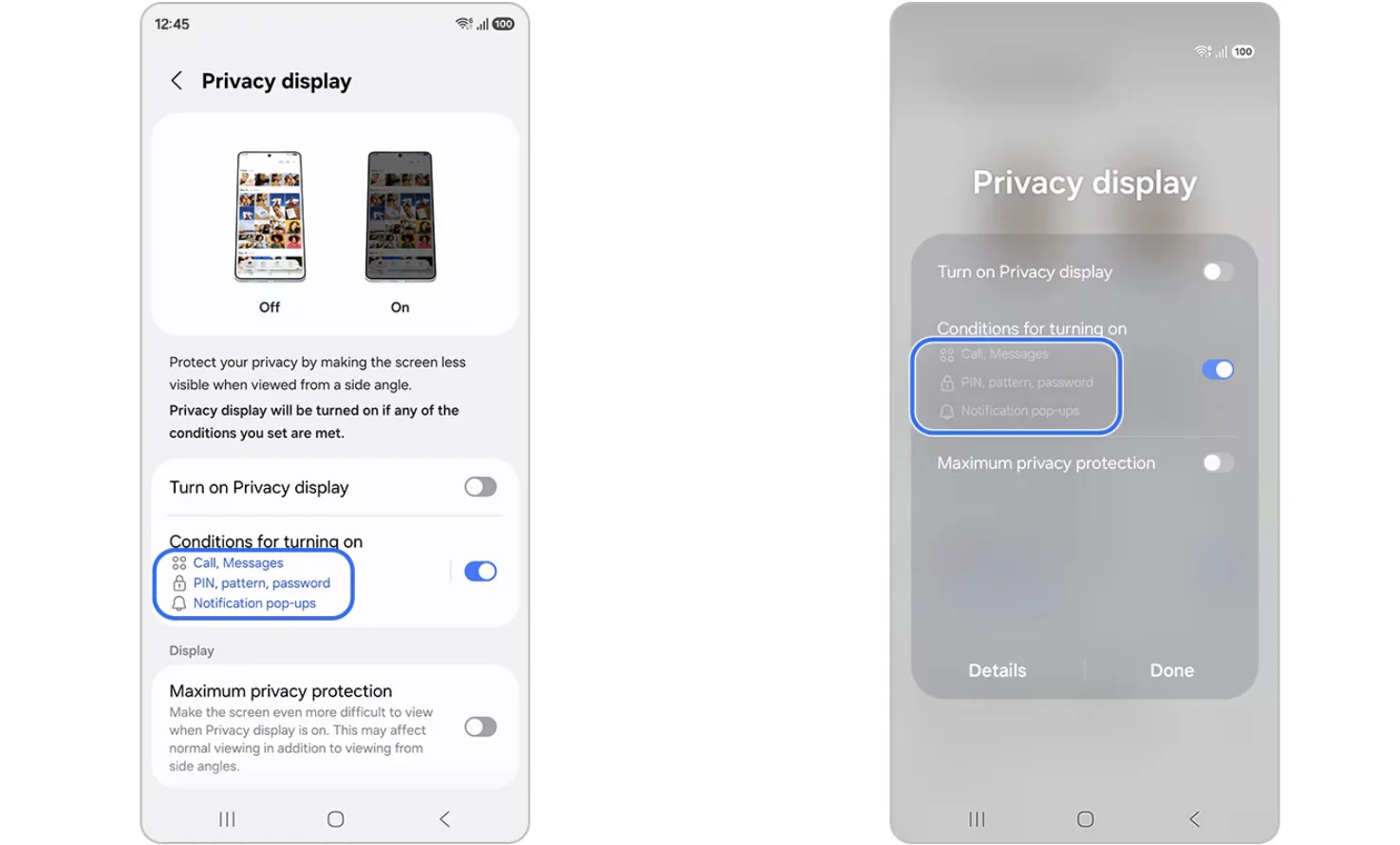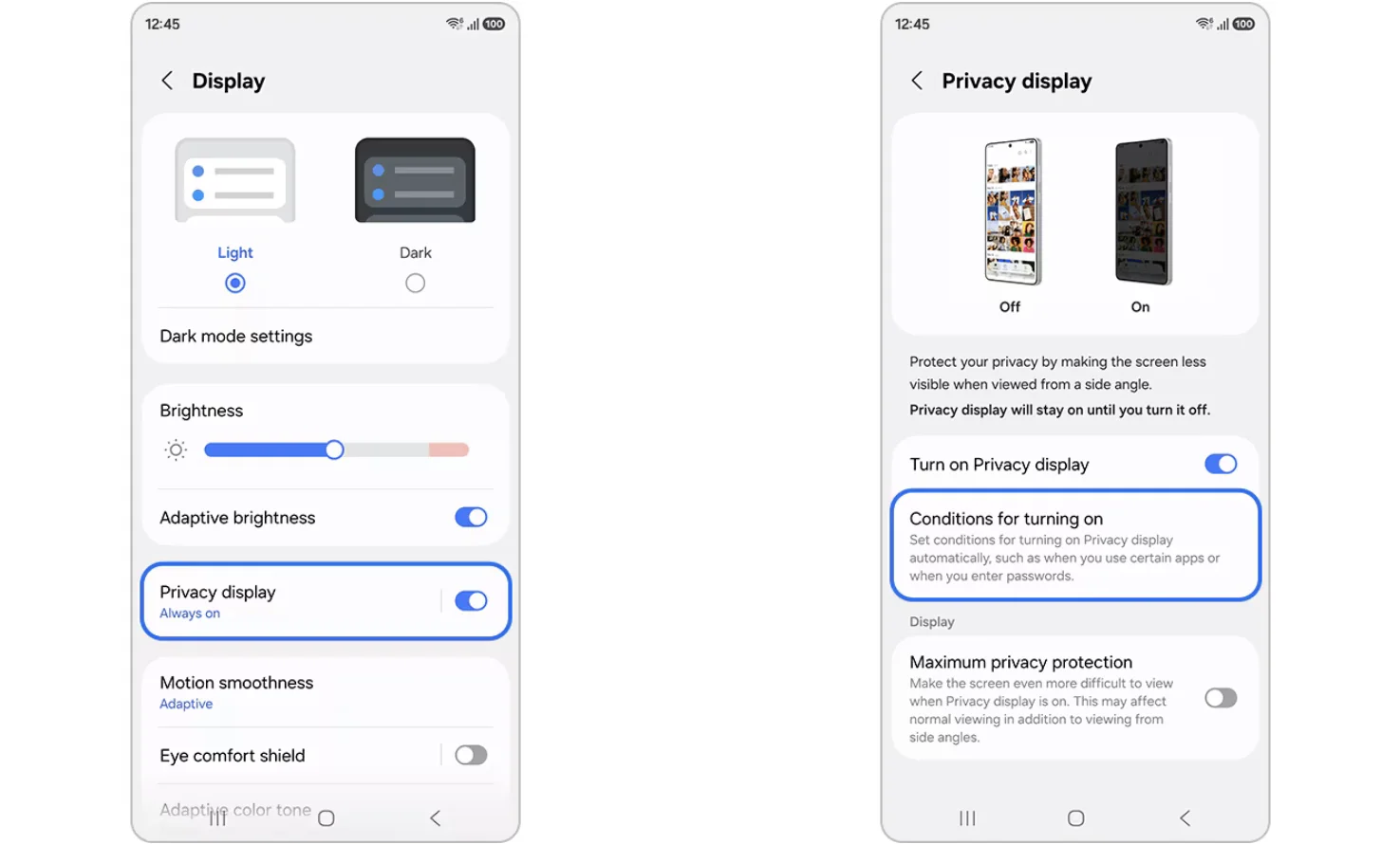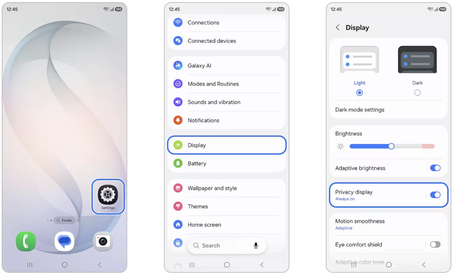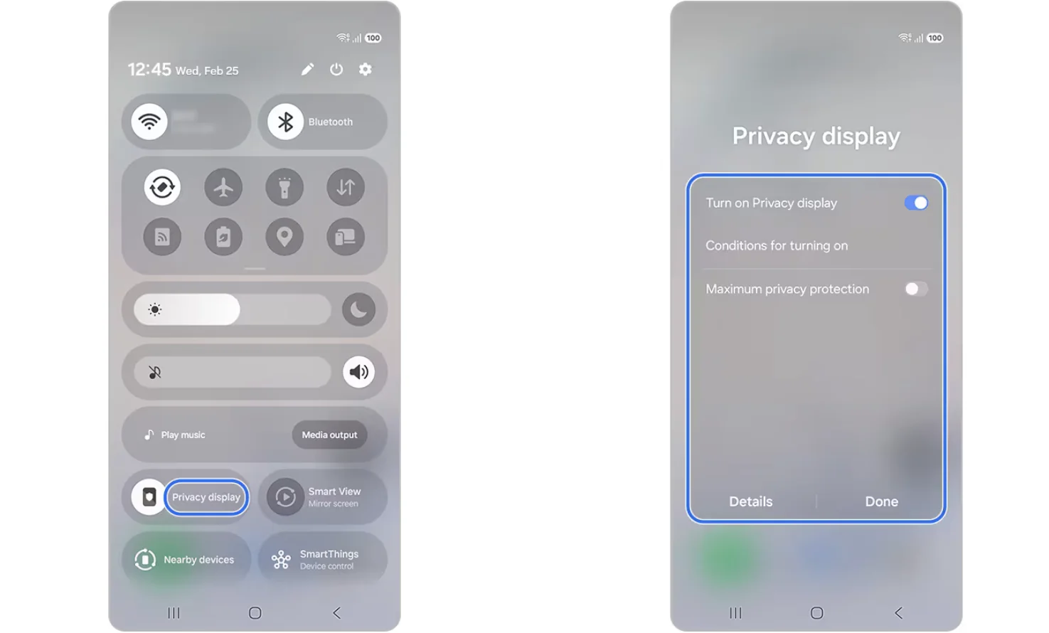 Privacy Display – це функція на основі передової технології дисплея Galaxy S26 Ultra, яка інтелектуально керує екраном, щоб обмежувати видимість контенту на екрані під час перегляду збоку.